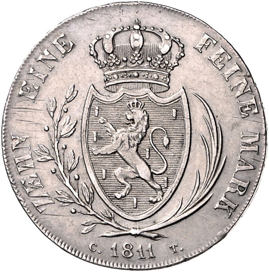 Friedrich August 1803-1816. Konventionstaler 1811C.-T. Lorbeerzweig mit 6 Früchten, mit vertiefter Randschrift. Kahnt 300, Davenport 738, AKS 25, Thun 220. min.just., min.Sf.a.Rd. ss-vz