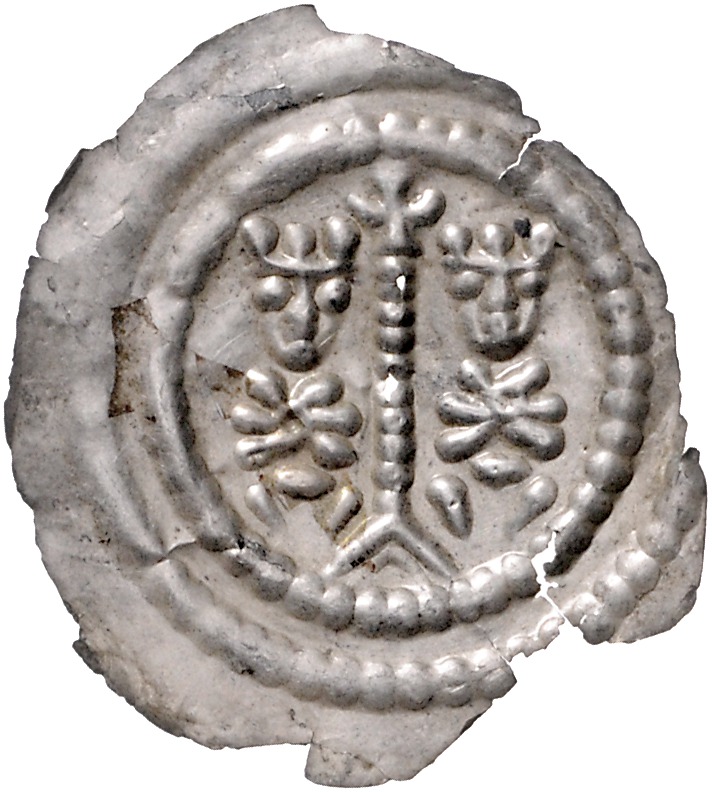 Friedrich II. 1215-1250. Brakteat o.J. Sitzendes Kaiserpaar von vorn, dazwischen Stab. Slg. Bonhoff 1203, Berger -. Rand etwas ausgebrochen 0,38 g. ss