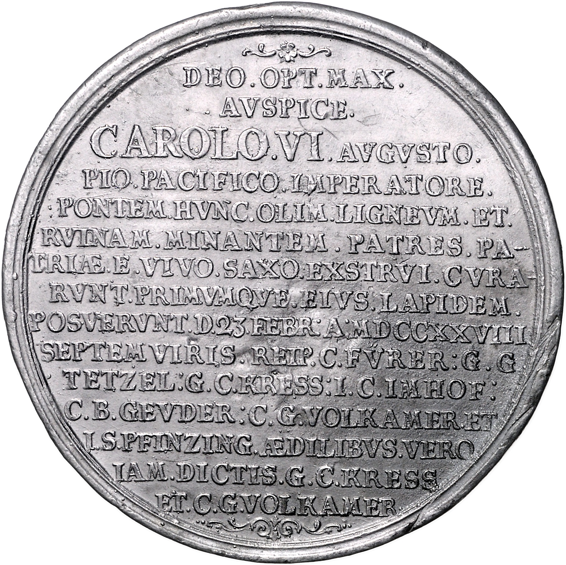 Bleimedaille 1728 (v. Vestner) auf die Grundsteinlegung zum Bau der Elisabeth-Brücke. Slg. Erlanger vgl. 1095-1097. 78,7 mm, 120,23 g. vz