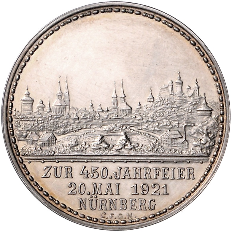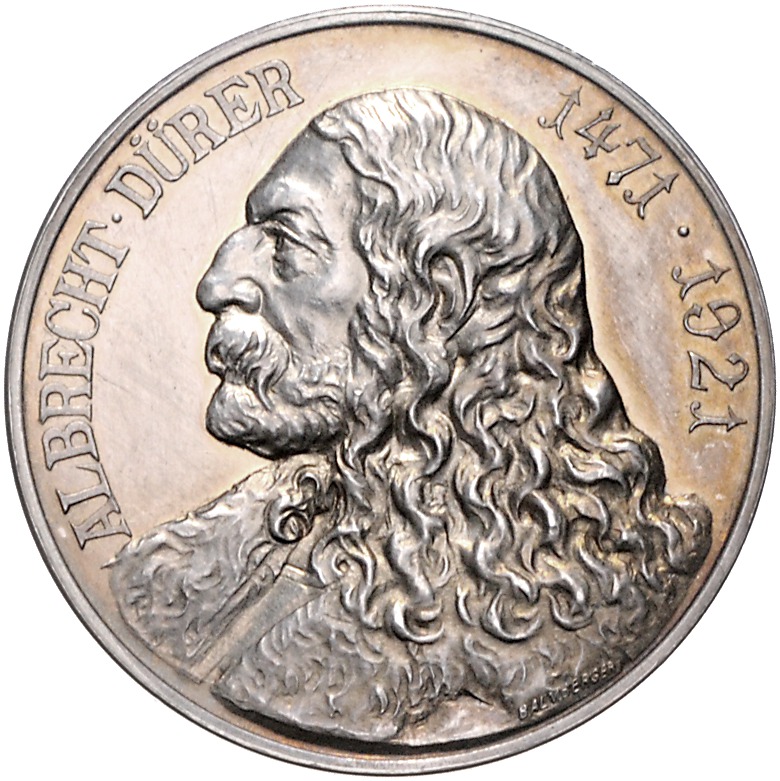 Silbermedaille 1921 (v. Balmberger) auf den 450. Geburtstag von Albrecht Dürer, i.Rd: Nr. 46 und Punze 990. Erlanger 913. Mende 117. Auflage 100 Exemplare 33,5 mm, 14,67 g. vz