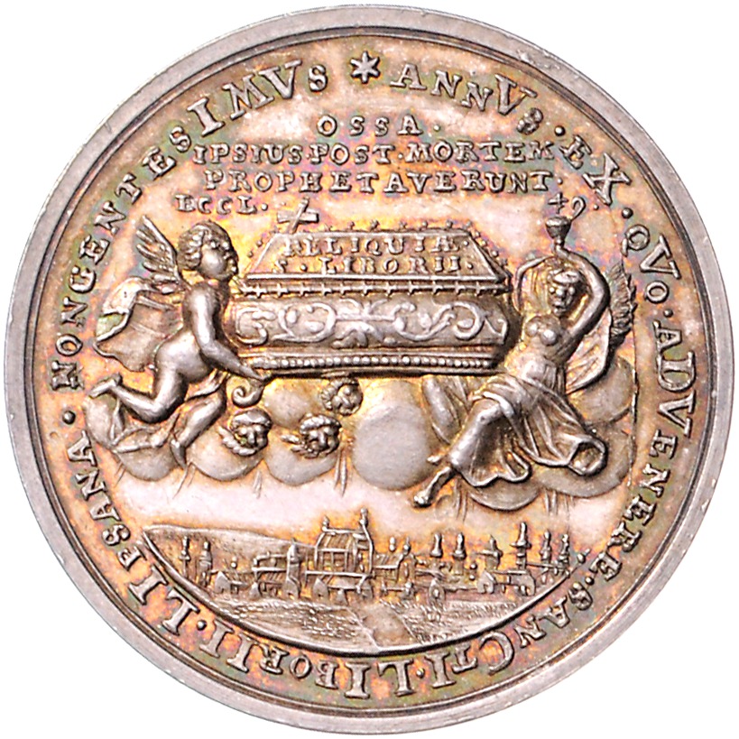 Clemens August von Bayern 1719-1761. Silbermedaille 1736 (unsign.) auf die 9. Säcularfeier der Ankunft des Hl. Liborius. Exemplar der Auktion Kricheldorf vom 26. Februar 1973, Schätzpreis damals 400 DM! Mit dem alten Münztütchen vom Sammler beschriftet. Weingärtner 266. Prachtexemplar mit herrlicher Patina 35,2 mm, 11,59 g. f.st