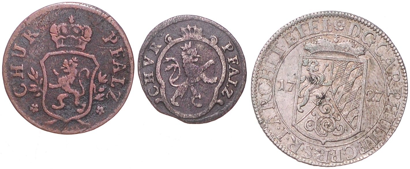 Karl Philipp 1716-1742. Lot von 3 Stücken: 20 Kreuzer 1727 | Zollpfennig 1766 | 2 Kreuzer 1744. Slg. Noss 358, 451, 458. ss