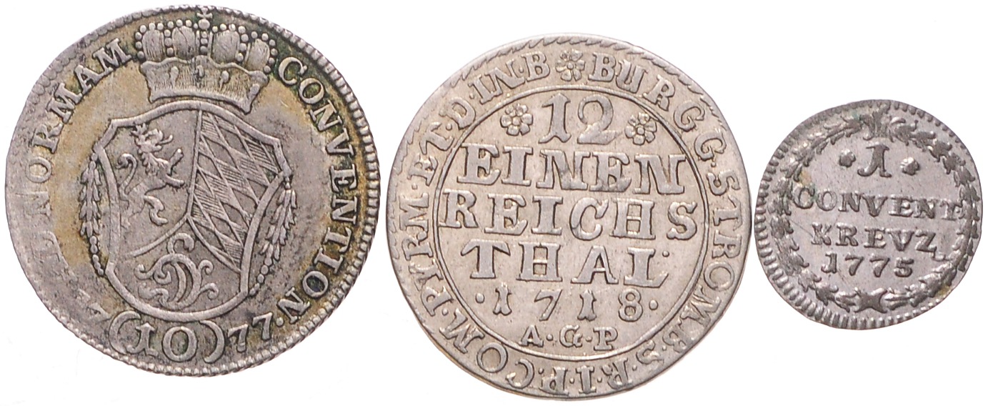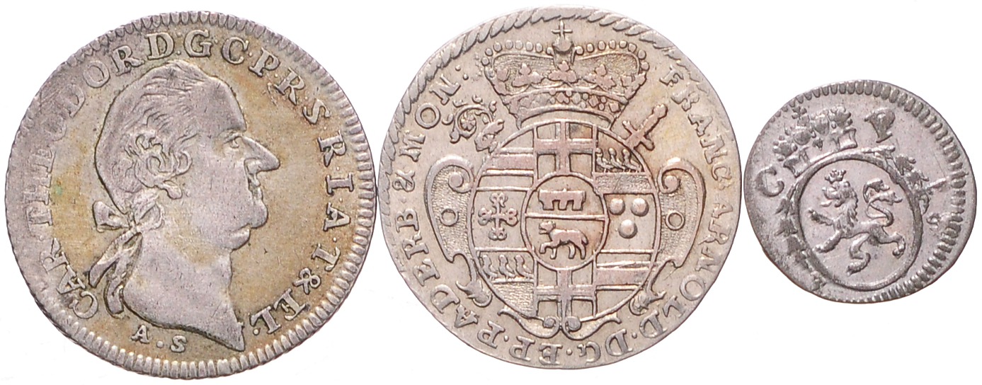 Karl Theodor 1742-1799. Lot von 3 Stücken: 10 Kreuzer 1777 AS Mannheim (selten) | 1 Kreuzer 1775 Convent | 1/12 Taler 1718 Paderborn. Schön 187, 184, 7. ss