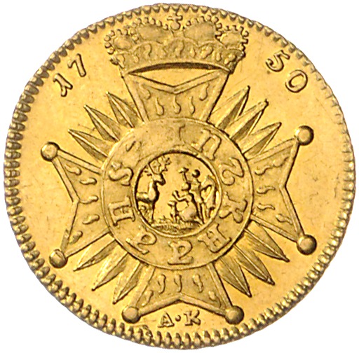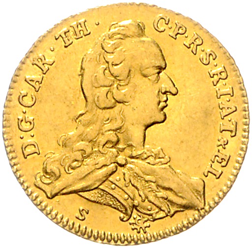 Karl Theodor 1742-1799. Dukat 1750 Es ist umstritten, ob es sich um eine pfälzische oder jülische Prägung handelt. Slg. Noss 954, Slg. Memmesheimer 2882, Haas 59, Friedberg 1416 (Jülich), 2034 (Pfalz). selten. vz