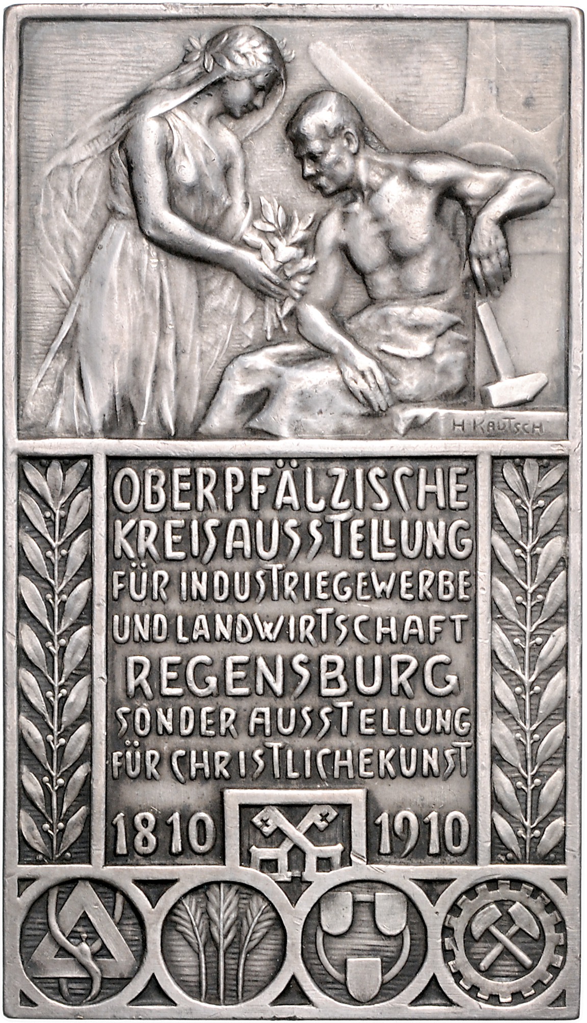 Versilberte Bronzeplakette 1910 (v. Kautsch) auf die Oberpfälzische Kreisausstellung für Industriegewerbe und Landwirtschaft Regensburg, Sonderausstellung für christliche Kunst 1810-1910, i.Rd: C. POELLATH BRONCE. 49,5x86,6 mm 104,54 g. vz