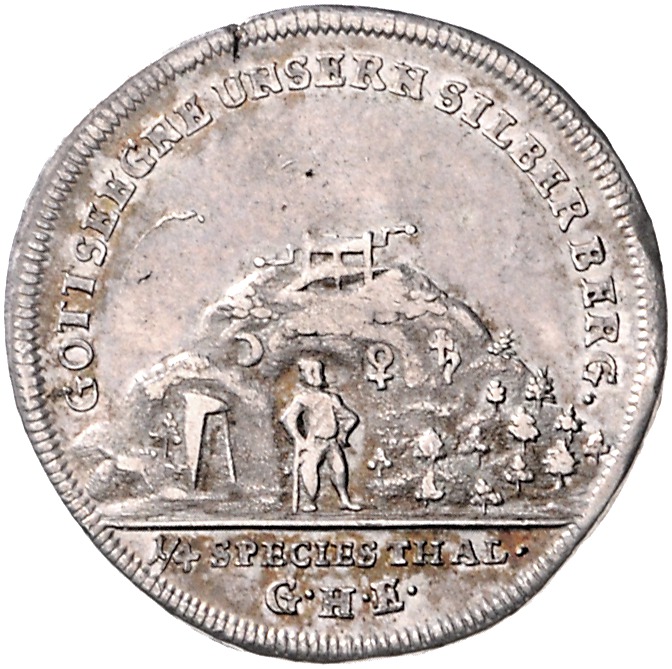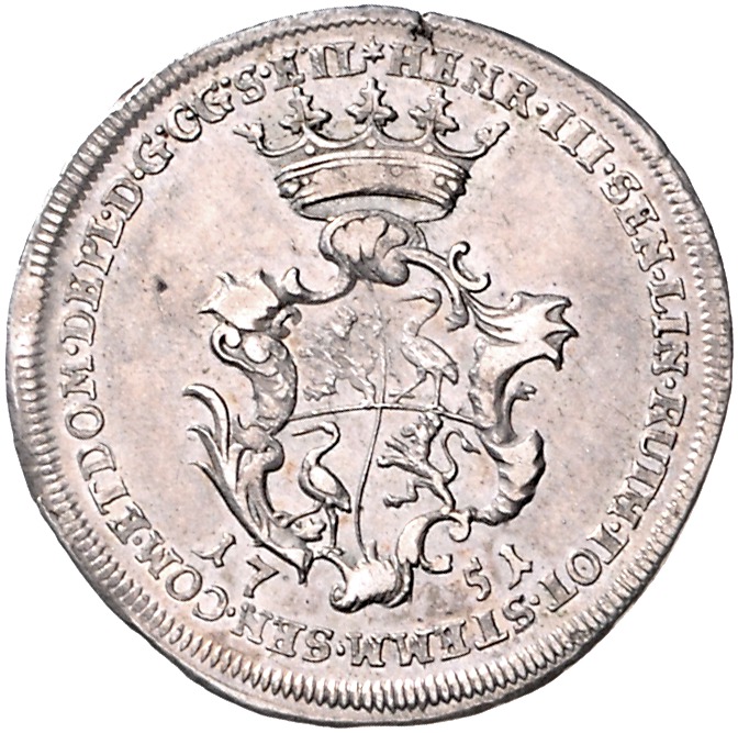 Heinrich III. 1733-1768. 1/4 Speziestaler 1751 Saalfeld Ausbeute der Grube Kleinreinsdorf. Müseler 50.2.1a. kl. Sr. am Rand. ss+