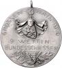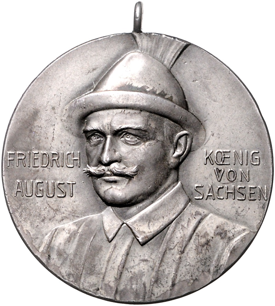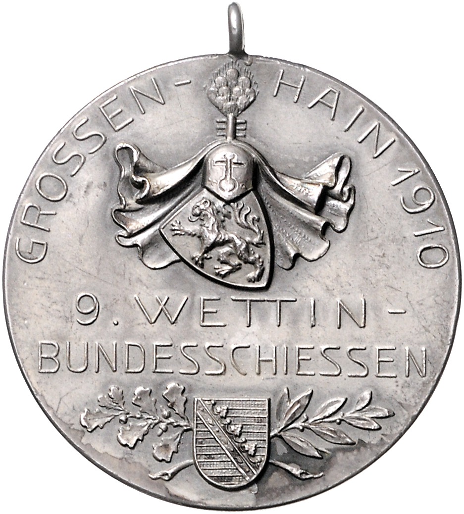 Friedrich August III. 1904-1918. Silbermedaille 1910 (unsign.) auf das 9. Wettin-Bundesschießen in Großenhain, i.Rd: 1000 SILBER. Peltzer 1217. mit Öse, mattiert, etwas fleckige Patina 40,3 mm, 24,65 g. ss-vz