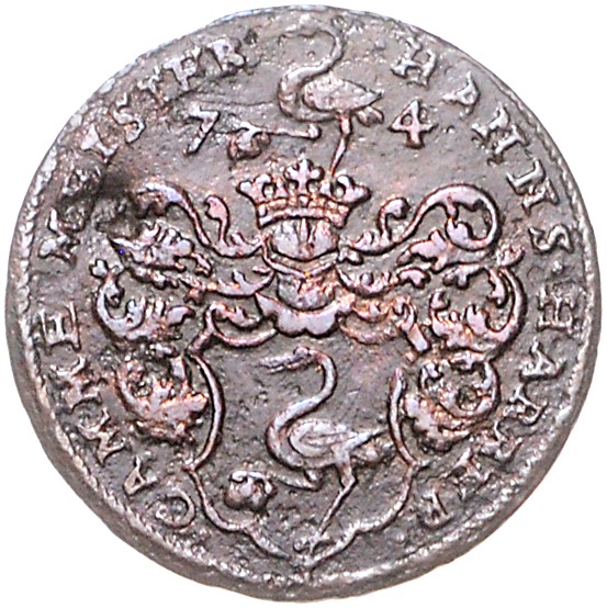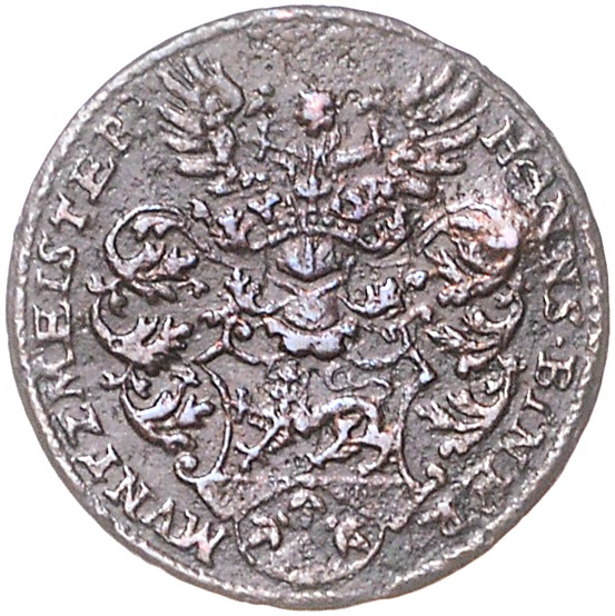 CU-Rechenpfennig 1574 Hans Biener, kurf. Münzmeister in Dresden 1556-1604 und Hans Harrer, kursächs. Kammermeister 1556-1580. Slg. Merseburger 4426, Neumann 32690. min. Korrosionsspuren. ss