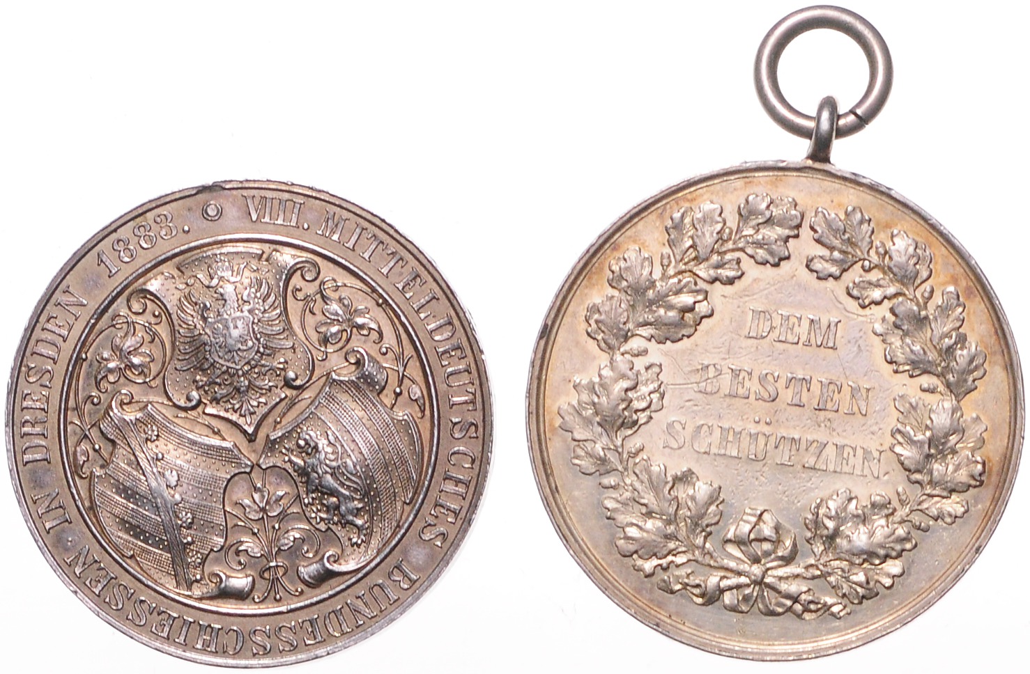 Lot von 2 Stücken: Silbermedaille o.J. (v. Barduleck) DEM BESTEN SCHÜTZEN (m. Öse u. Ring 33,8mm 14,6g) | Silbermedaille 1883 (v. Wastian) auf das VIII. Mitteldeutsche Bundesschießen (entfernte Öse 33,2mm 18,7g). Barduleck 56, Gebauer 18.10, Slg. Peltzer 1010. ss und ss-vz