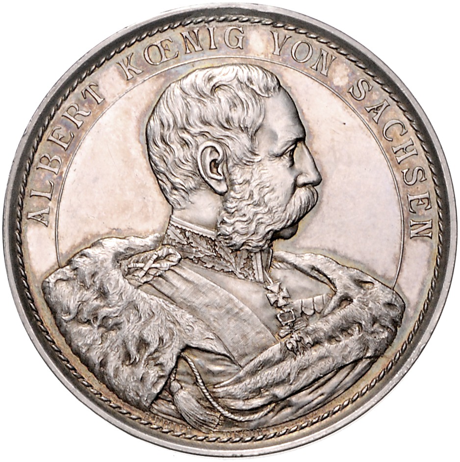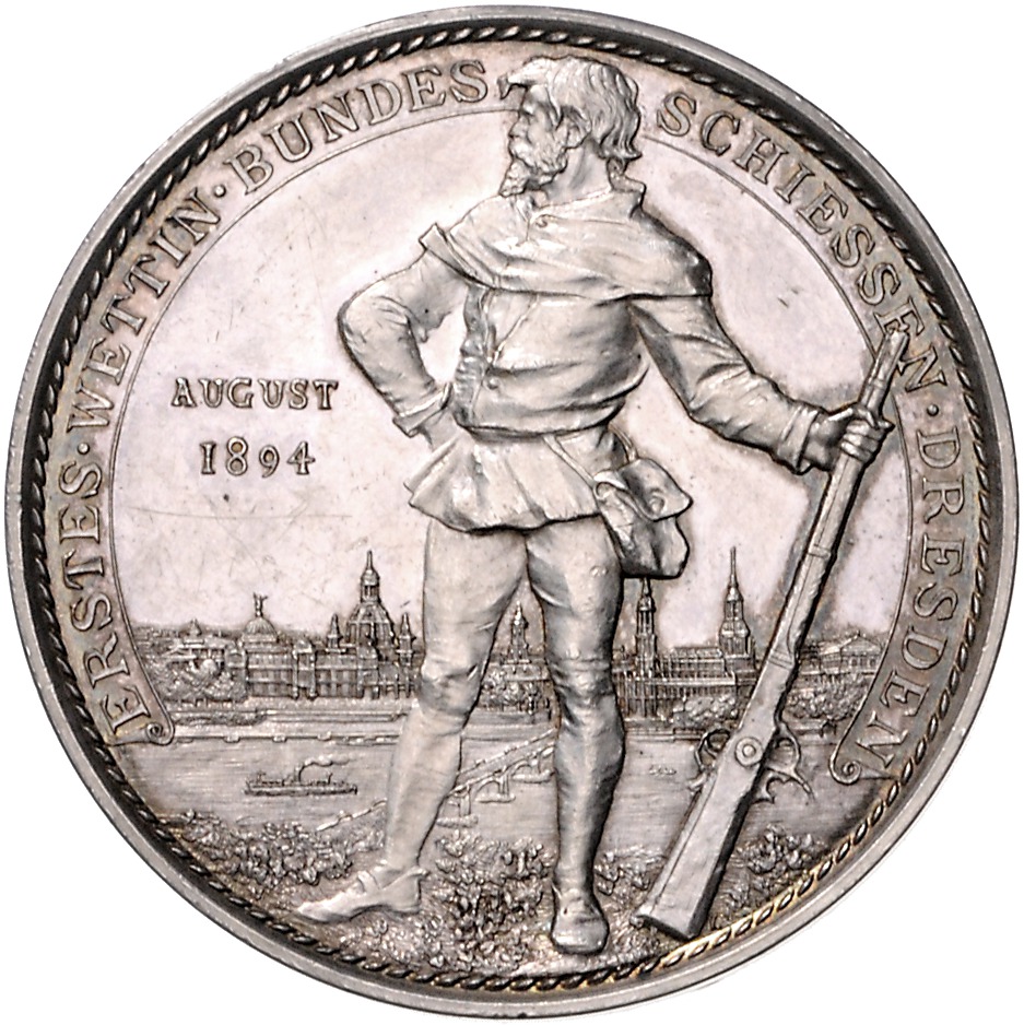 Silbermedaille 1894 (v. Diller) auf das Erste Wettin-Bundesschießen. Gebauer 1894.23, Slg. Peltzer 1014. f.Kr. 40,4 mm, 26,26 g. vz