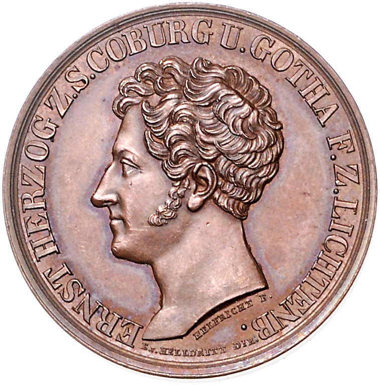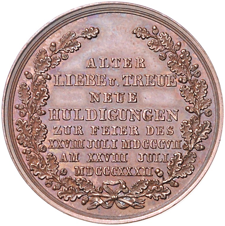 Ernst I. 1826-1844. Bronzemedaille 1832 (v. Helftricht) auf die Huldigung. Slg. Merseburger 3292 (Ag). 32,5 mm, 21,53 g. vz-st