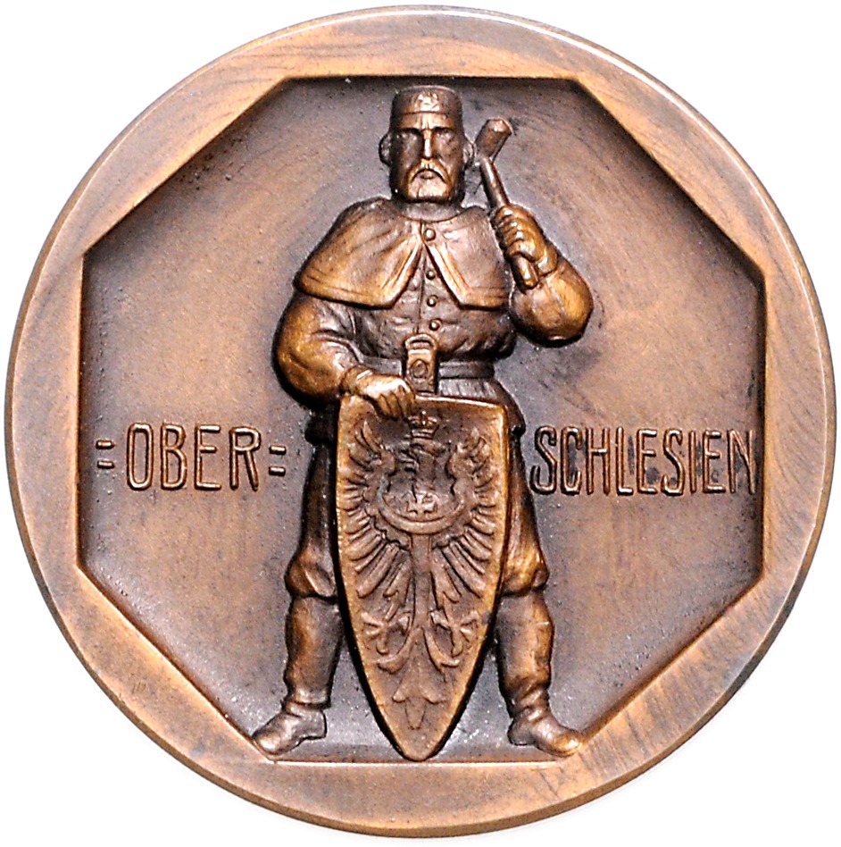 Lot von 2 Stücken: Eisengussmedaille 1921 (v. Th. von Gosen) auf den Kampf um Oberschlesien und die Volksabstimmung (gussfrisch, mit Öse 38,7mm 17,41g) | Bronzemedaille 1921 (unsign.) auf die Volksabstimmung am 20. März (vz 40,5mm 27,11g). Jaschke/Maercker 2410.