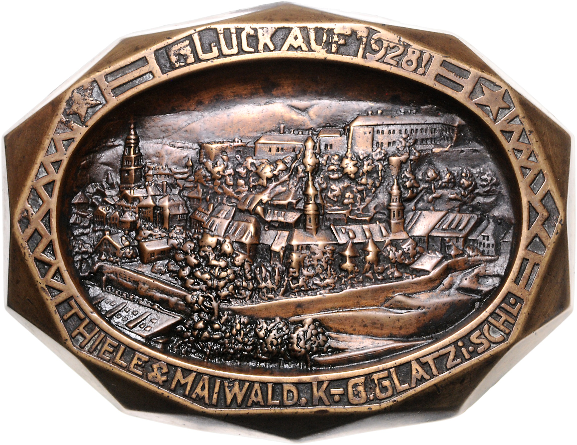 Bronzehohlguss 1928 der Maschinenfabrik und Eisengießerei Thiele & Maiwald, GLÜCK AUF! mit Ansicht der Stadt. 150x120 mm 481,00 g. ss-vz