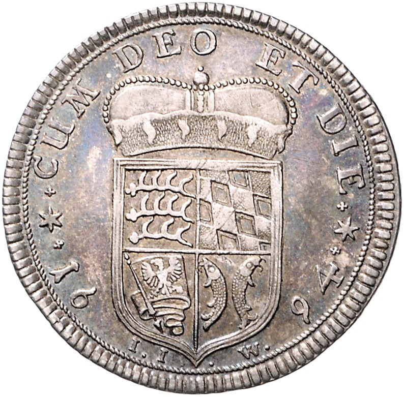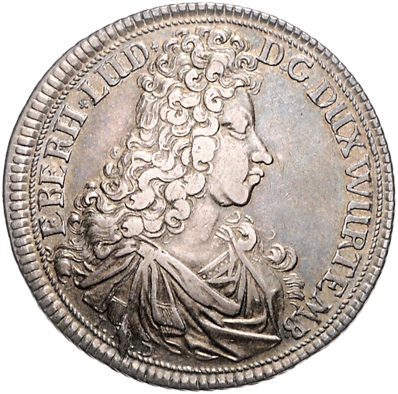 Eberhard Ludwig 1693-1733. 1/2 Taler 1694. Klein/Raff 47, Ebner 44. herrliche Patina. f.vz