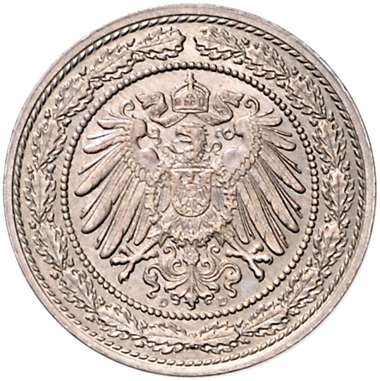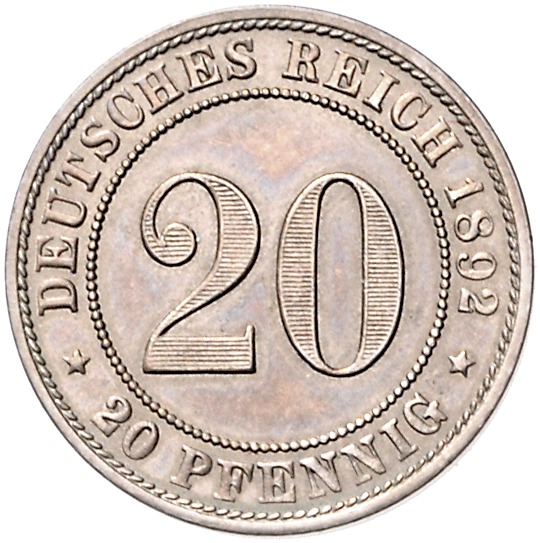 20 Pfennig 1892 D tiefstehende 9 in Jahreszahl. Jaeger 14. vz