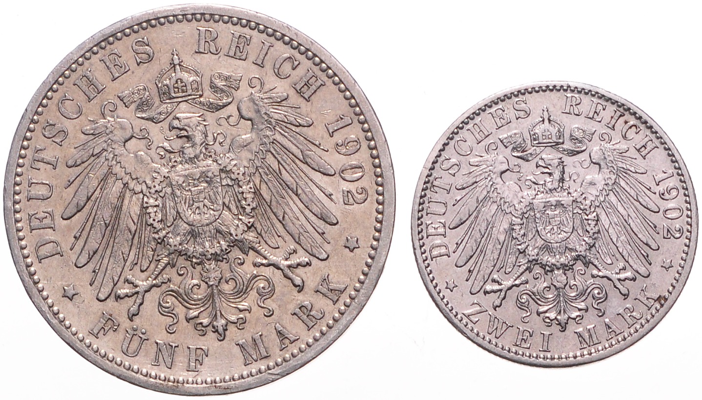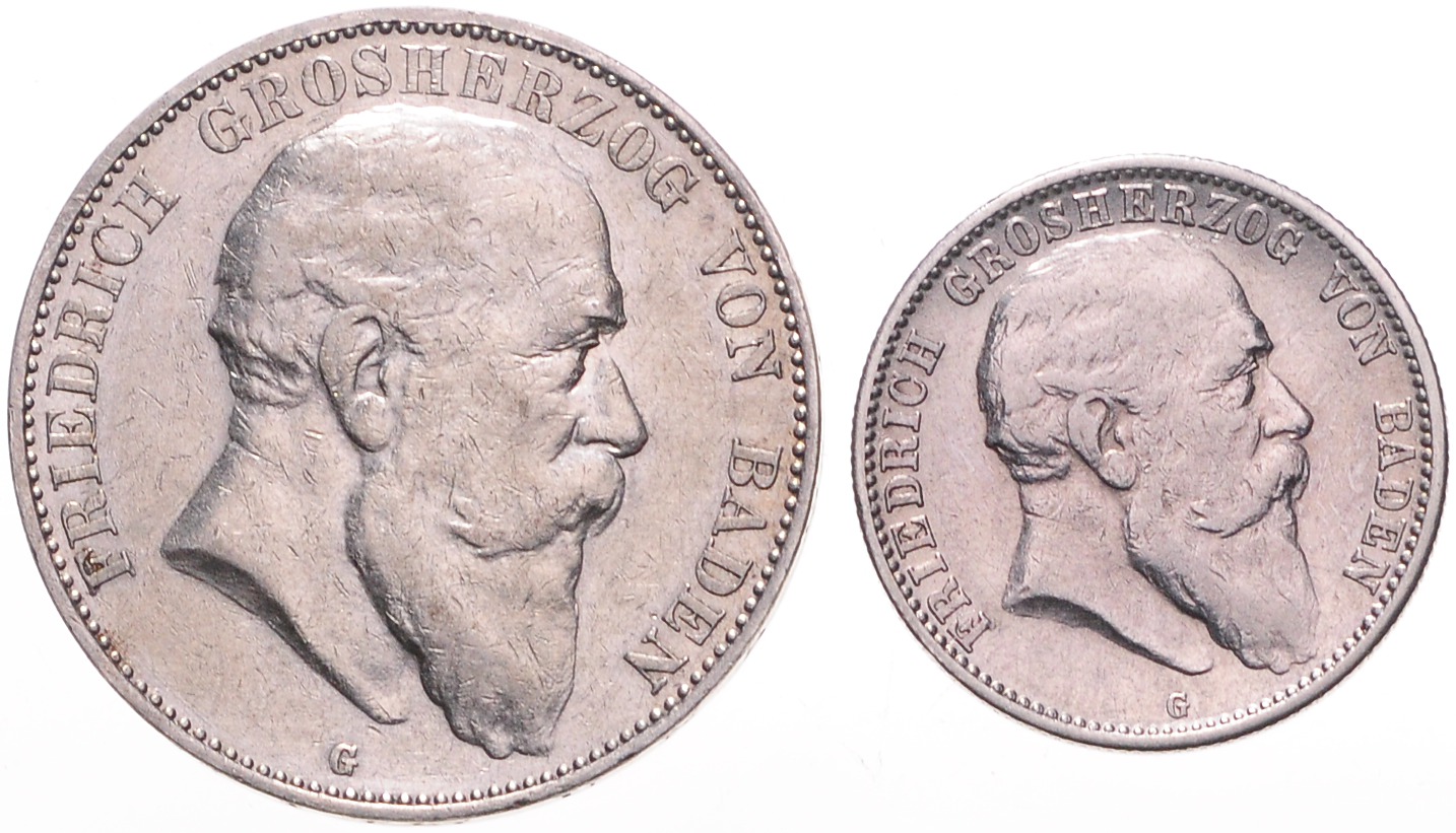 Friedrich I. 1856-1907. Lot von 2 Stücken: 2 und 5 Mark 1902. Jaeger 32,33. meist ss