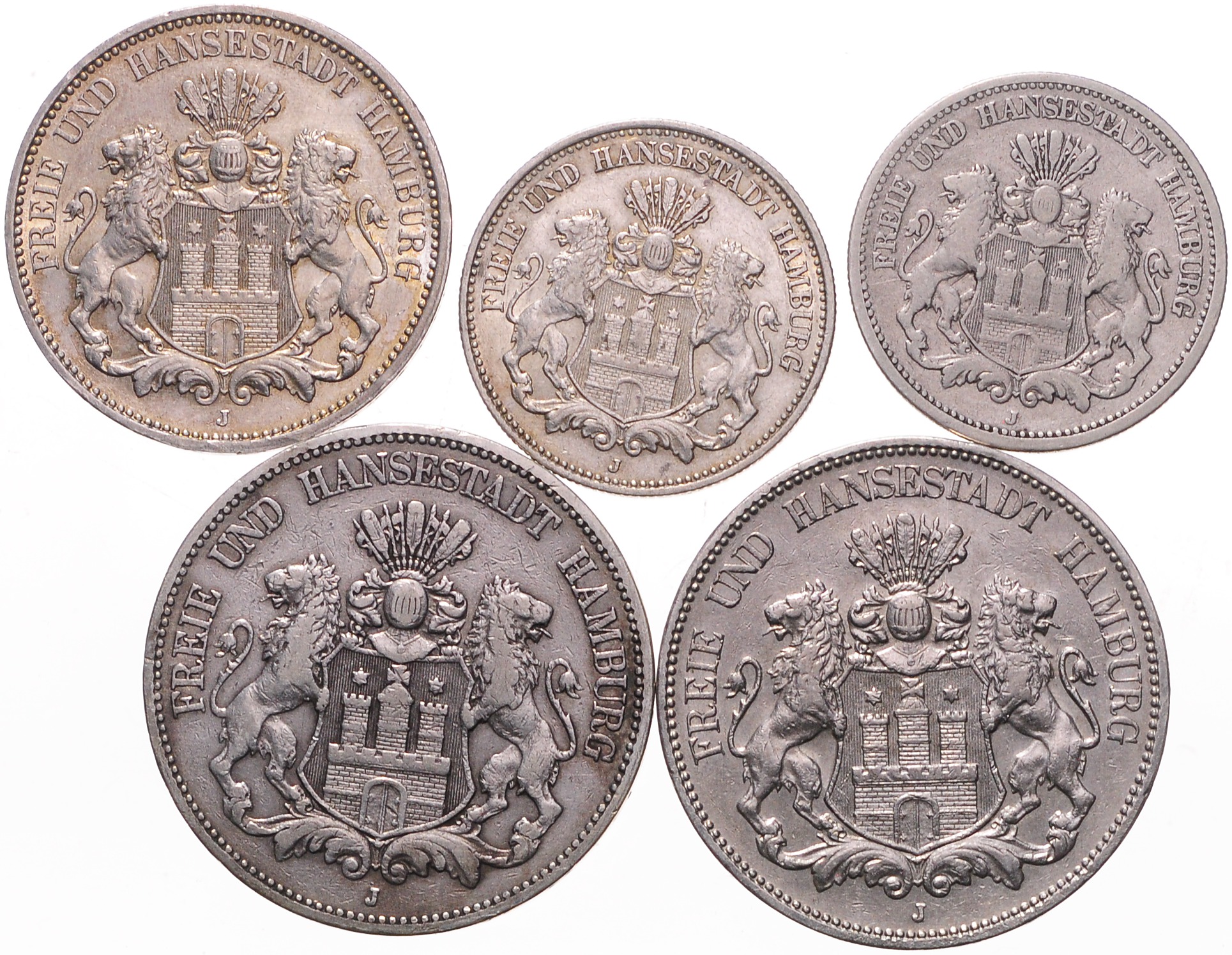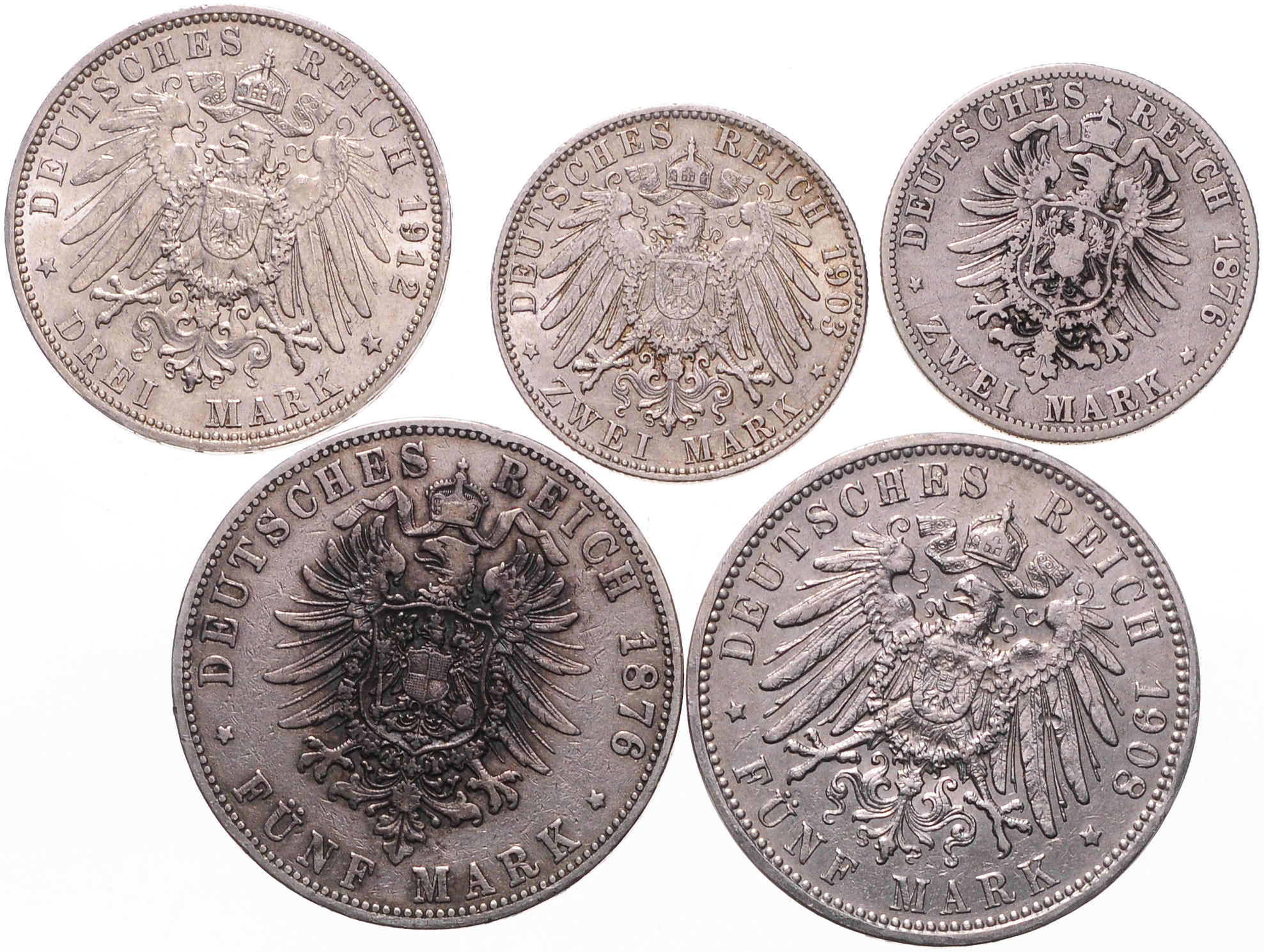 Lot von 5 Stücken: 2 Mark 1876 J u. 1903 J, 3 Mark 1912 J und 5 Mark 1876 J u. 1908 J. Jaeger 61-65. ss