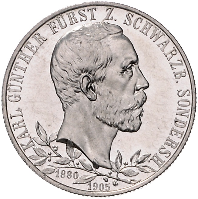 Karl Günther 1880-1909. 2 Mark 1905 (A) Zum 25-jährigen Regierungsjubiläum. Jaeger 169b. breiter Randstab, winz. Kr. PP-