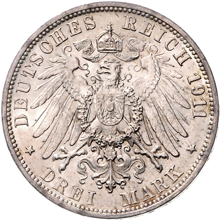 Wilhelm II. 1891-1918. 3 Mark 1911 F Zur Silbernen Hochzeit am 8.4.1911. Jaeger 177a. vz-st
