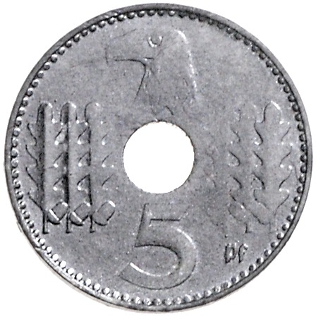5 Reichspfennig o.J. Einseitige Prägung der Wertseite, rückseitig nur Perlkreis. Exemplar der Sammlung Graichen. Jaeger zu 618, Schaaf -, Beckenbauer -. ss-vz