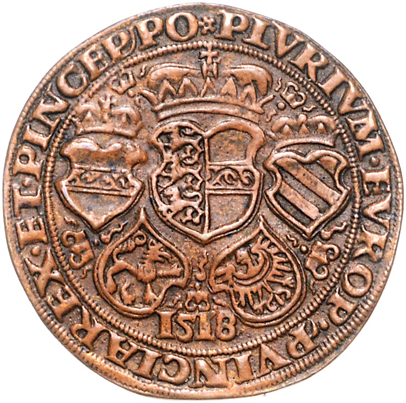 Maximilian I. 1486-1508-1519. 1/2 Schauguldiner 1518 St. Veit, alte Bronze-Sammleranfertigung, schwacher Rest einer Tuschezahl, Variante der Umschrift: CARI: (statt CAR). Ähnliche Stücke werden teilweise in Auktionen als `Probe` beschrieben, was wohl eher unwahrscheinlich ist. Egg S. 196 Nr. 34 var., Probszt 3 var. alter Guss. ss