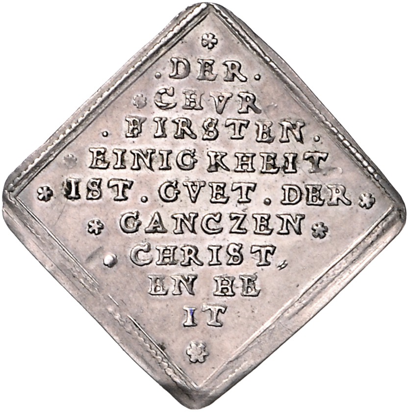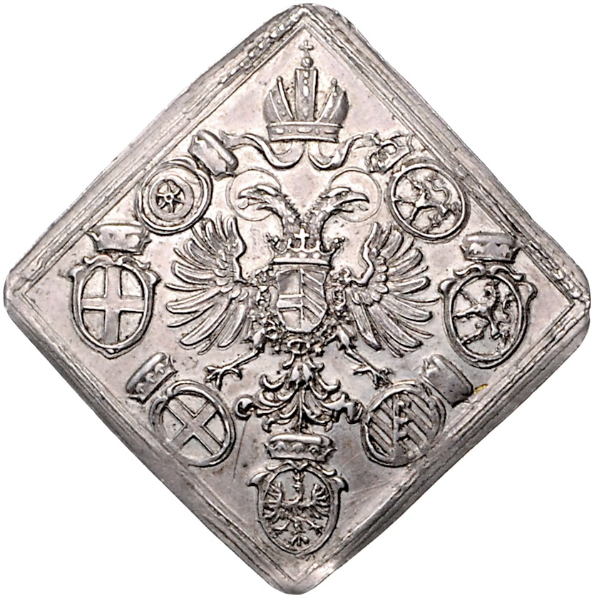 Ferdinand II. 1619-1637. Silberklippe o.J. (1619) auf seine Krönung in Frankfurt. Exemplar der Slg. Willy Fuchs (Peus 395) und der Slg. des Marquis de Hohenkubin (Lanz, Graz, 7.12.1973, Nr. 307). J.u.F. 1879. mit dem Originalzettel der Slg. Fuchs, 28x28mm 4,00 g. stempelfrisches Prachtexemplar