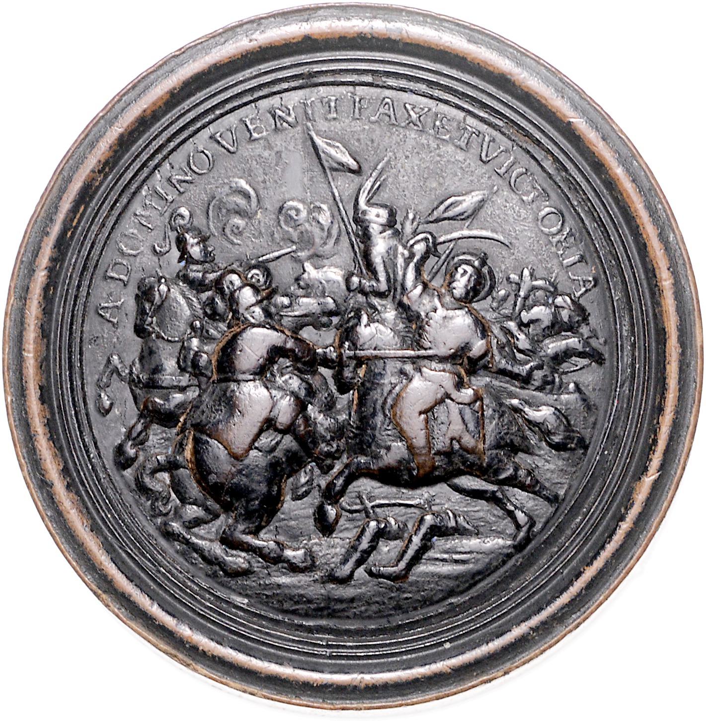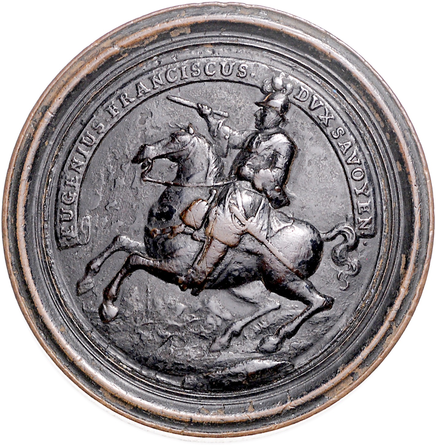 Leopold I. 1657-1705. Brettstein aus mittelbraunem Holz, auf Eugen v. Savoyen und die Türkenkriege. Bildseiten beidseitig geschwärzt. Popelka Vs. 12 Rs. -. 61,3 mm, 25,48 g. ss