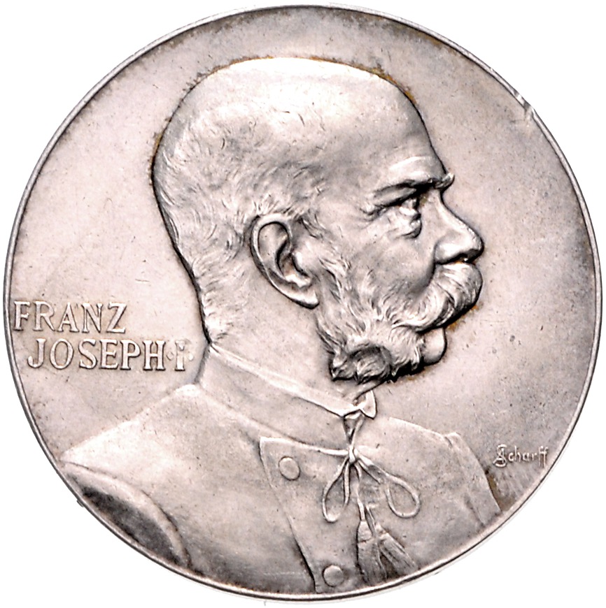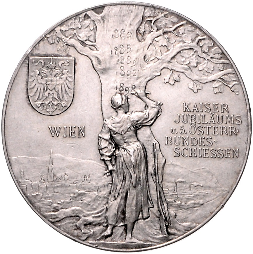 Franz Joseph I. 1848-1916. Silbermedaille 1898 (v. Scharff) auf das Kaiserjubiläums- und 5. Österreichisches Bundesschießen in Wien, i.Rd. Punze `A im Kreis`. Hauser 5211 (kleiner). Steulmann ÖV 2, kl.Rf. 37,3 mm, 24,98 g. vz