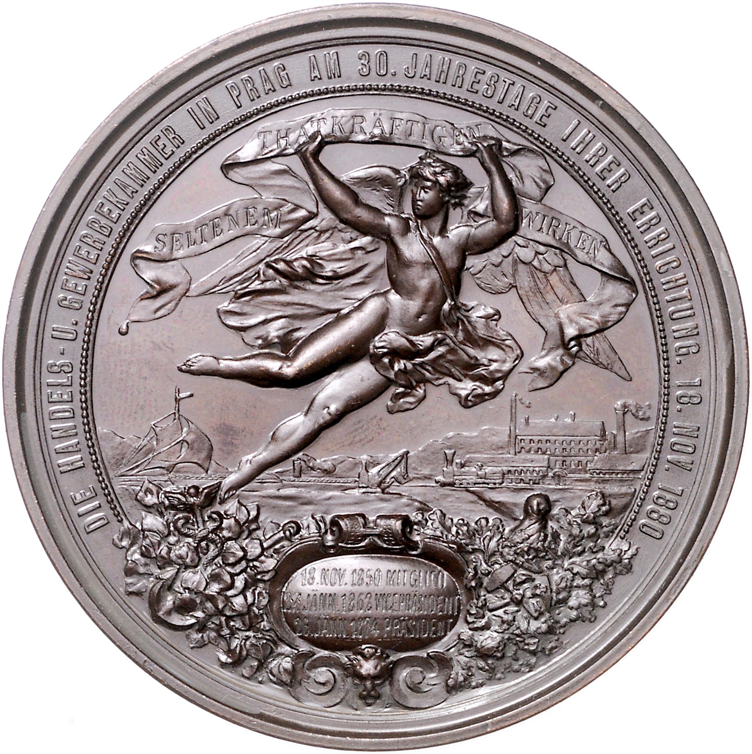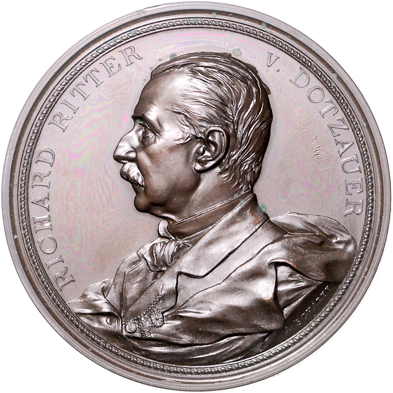 Bronzemedaille 1880 Widmungsmedaille der Handels- und Gewerbekammer in Prag zu ihrem 30-jährigen Bestehen mit Brustbild ihres Präsidenten Richard Ritter von Dotzauer. Hauser 1680, Loehr 47, Wurzbach 1702. 64,2 mm, 103,12 g. vz