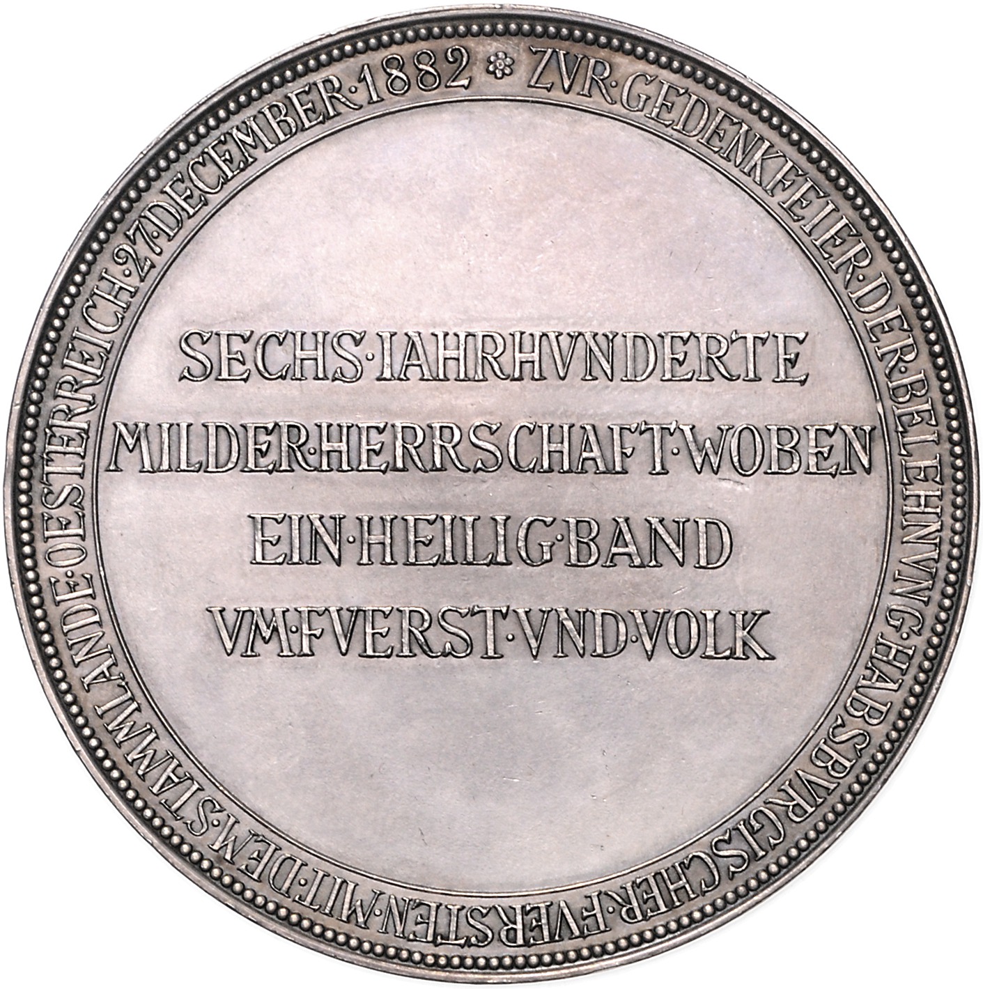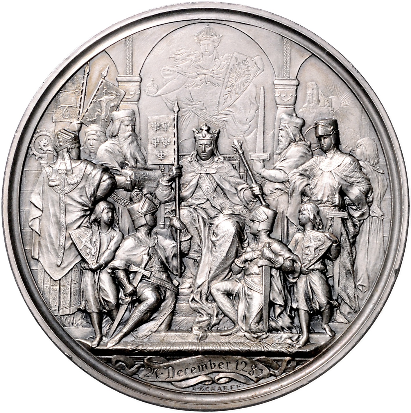 Silbermedaille 1882 Darstellung des Belehnaktes durch Kaiser Rudolf I. an seine Söhne Albrecht und Rudolf, i.Rd: A im Kreis. Hauser 1687, Wurzbach 6926. 61,0 mm, 97,08 g. vz