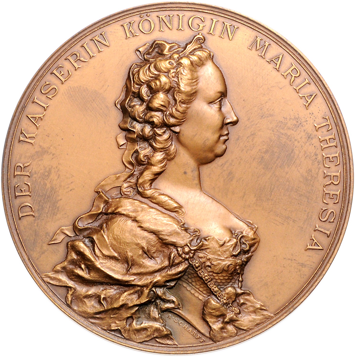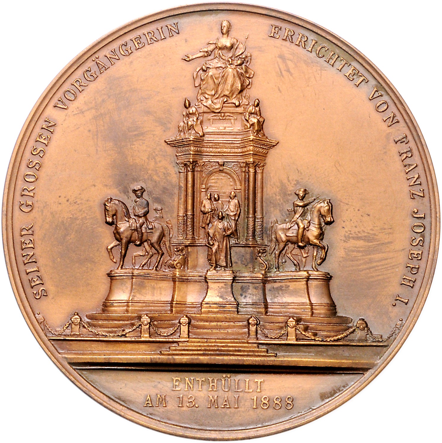 Lot von 2 Stücken: Bronzemedaille 1888 auf die Enthüllung des Maria-Theresia-Denkmals in Wien, ohne Randpunze. 64,1mm 105,49g | Bronzemedaille 1902 auf den berühmten Numismatiker Professor Dr. JOSEF UNGER zu seinem 50jährigen Doktorjubiläum, Widmung seiner Schüler und Freunde. 50,8mm 62,97g. Hauser vgl. 2416, 7945, Wurzbach vgl. 6049, 8920. beide neuere Prägungen. vz
