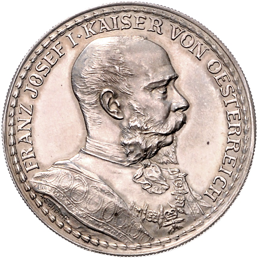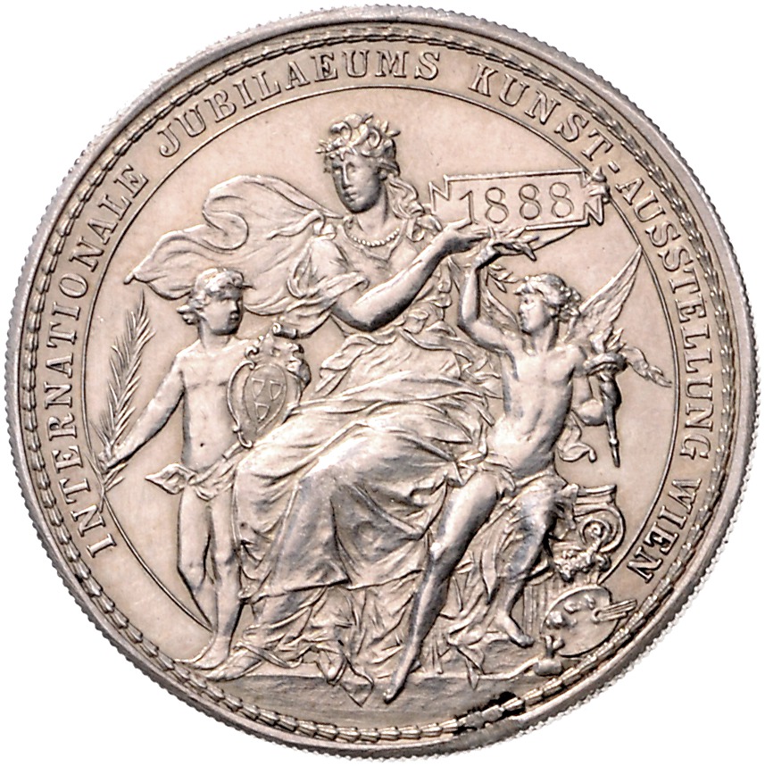 Silbermedaille 1888 auf die Internationale Jubiläums - Kunstausstellung in Wien. Hauser 2960, Loehr 196. Riffelrand mit Silberpunze A im Kreis, l.ber., Rs: Prüfspur bei 5 Uhr 36,7 mm, 24,76 g. f.vz