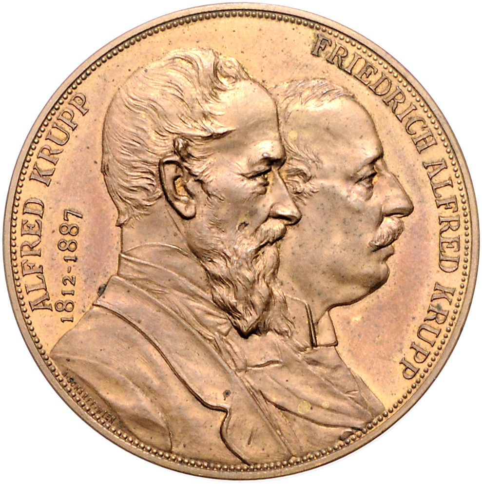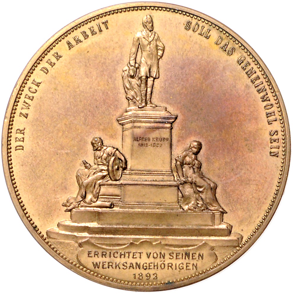 Bronzemedaille 1892 auf Alfred Krupp und die Errichtung seines Denkmals in Essen. Wurzbach 4786. etwas fleckig 42,4 mm, 36,30 g. f.vz