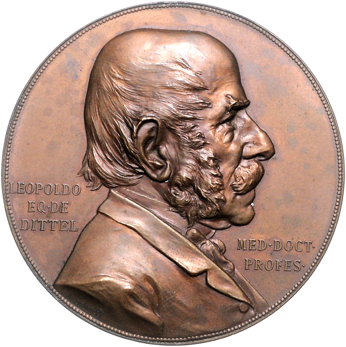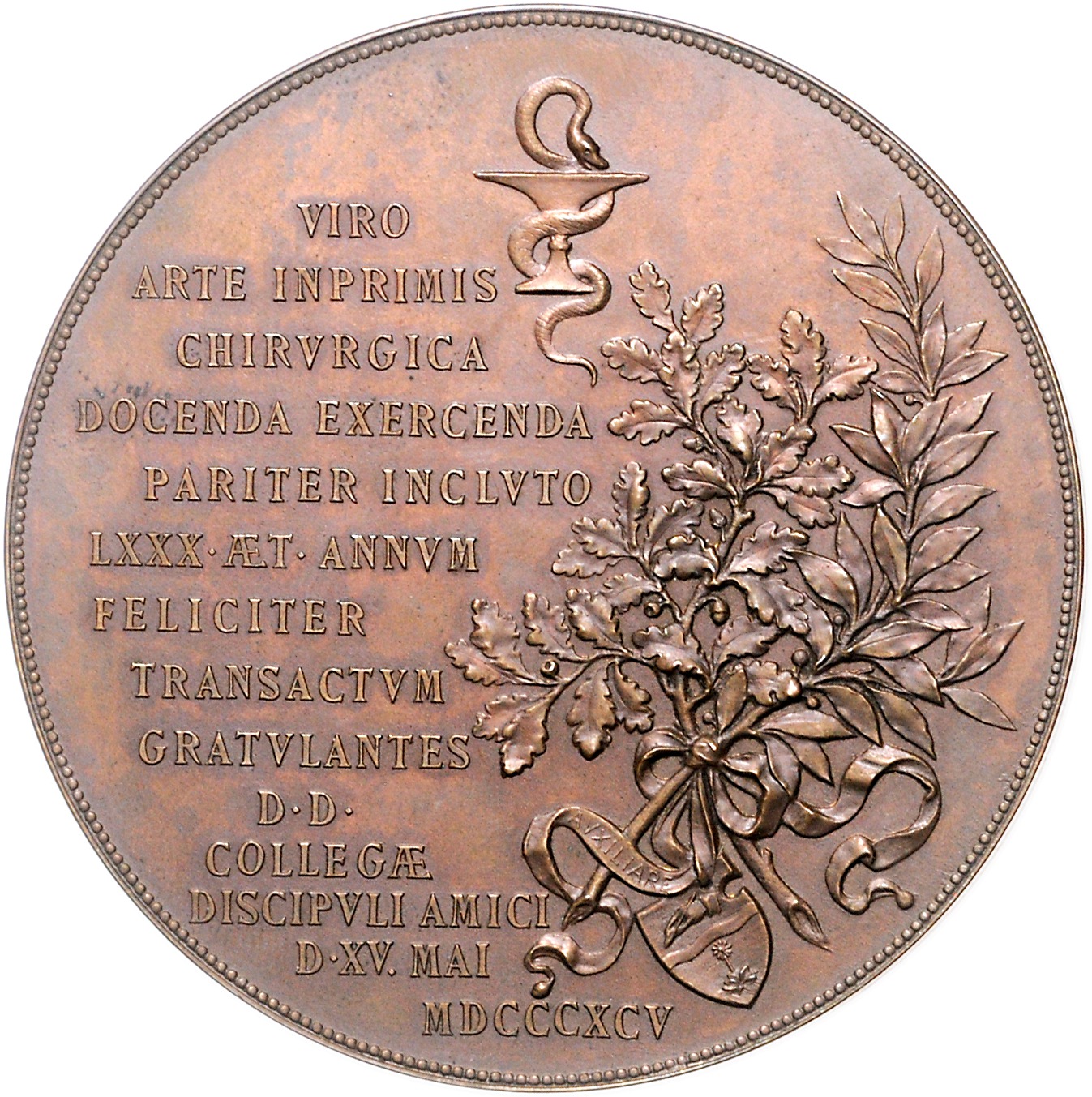 Bronzemedaille 1895 auf den Wiener Chirurgen und Urologen Leopold von Dittel anlässlich seines 80. Geburtstages. Hauser 7294, Loehr 261, Slg. Brettauer 268. 58,3 mm, 72,80 g. vz-