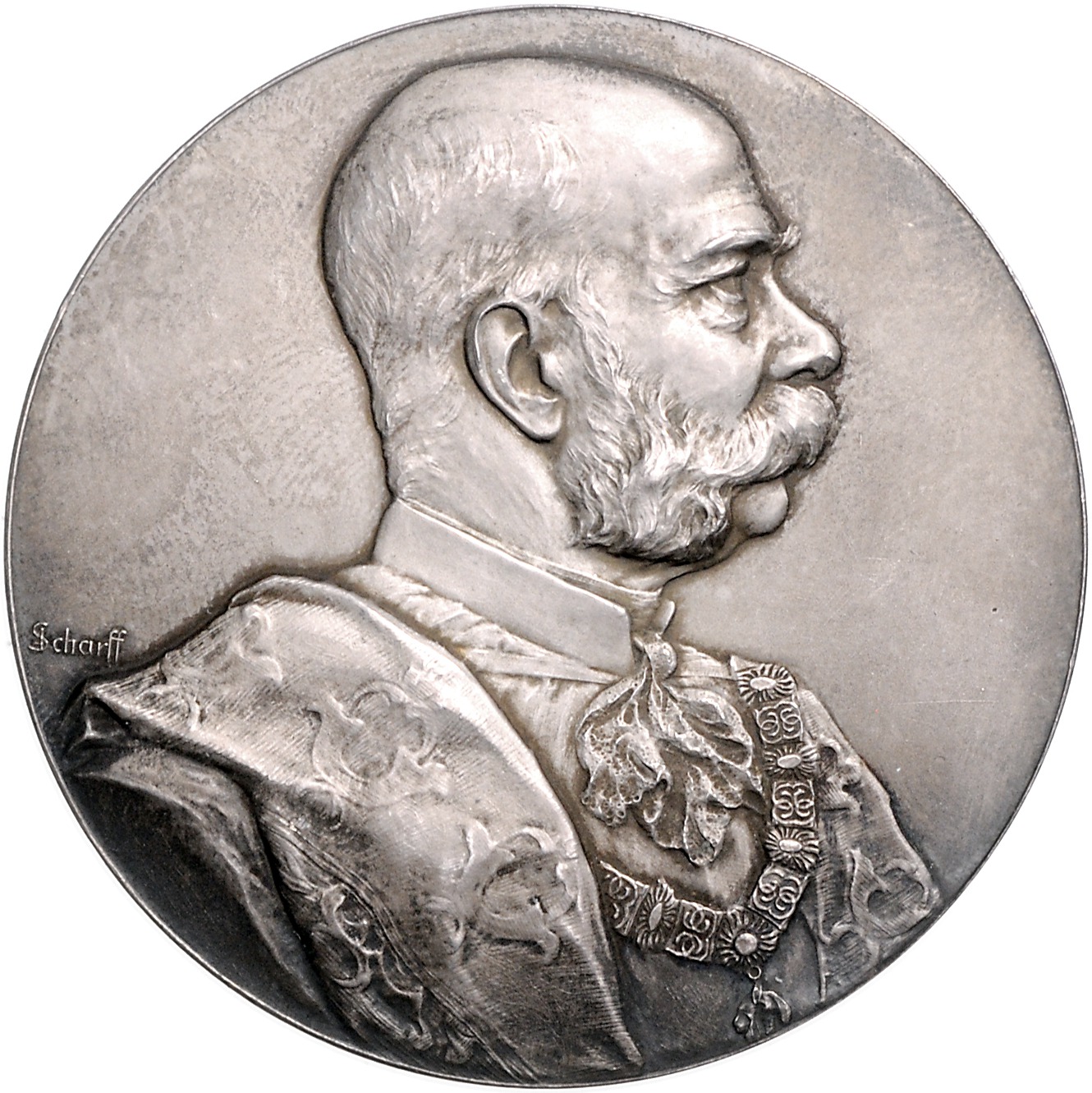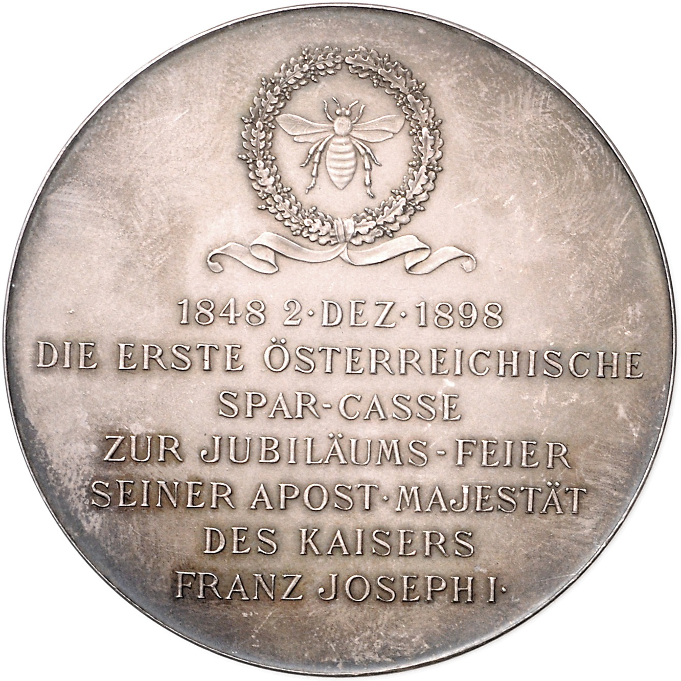 Silbermedaille 1898 auf das 50-jährige Regierungsjubiläum des Kaisers, gewidmet von der Ersten Österreichischen Sparkasse, i.Rd: Dianakopf und JC. Hauser 956, Loehr 311. 57,4 mm, 64,47 g. vz