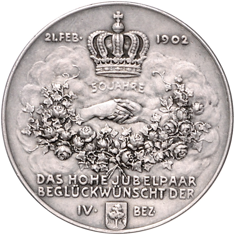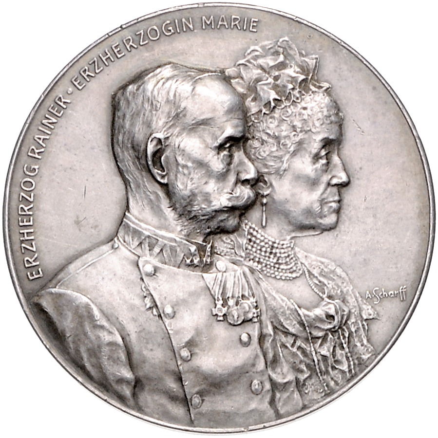 Silbermedaille 1902 auf die Goldene Hochzeit von Erzherzog Rainer und Erzherzogin Marie, Widmung des 4. Bezirks, i.Rd: A im Kreis. Hauser 450, Wurzbach 7804. winz.Rf., mattiert 38,5 mm, 21,95 g. f.vz