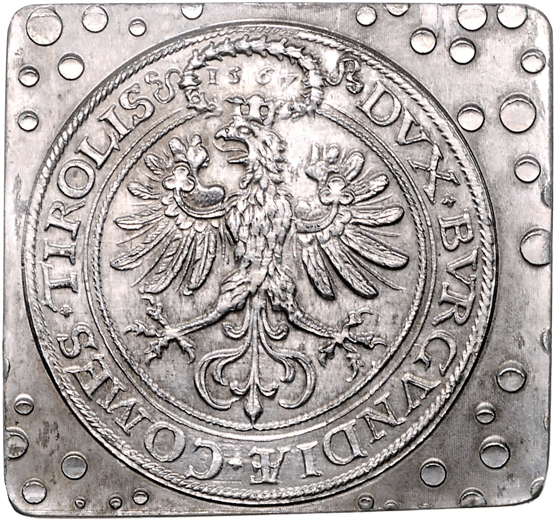 Erzherzog Ferdinand 1564-1595. Zinnklippe vom Guldentaler 1567, späterer Abschlag bzw. neuere Sammleranfertigung. 46,9x43,6 mm 23,80 g. ss-vz