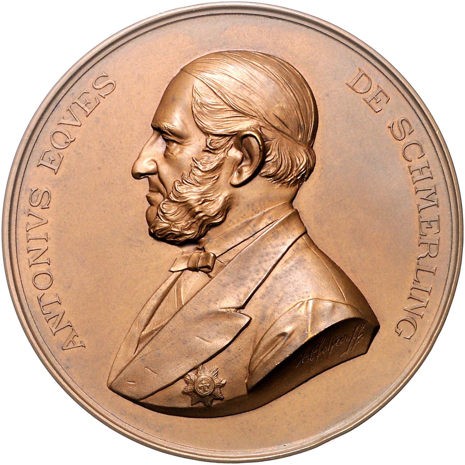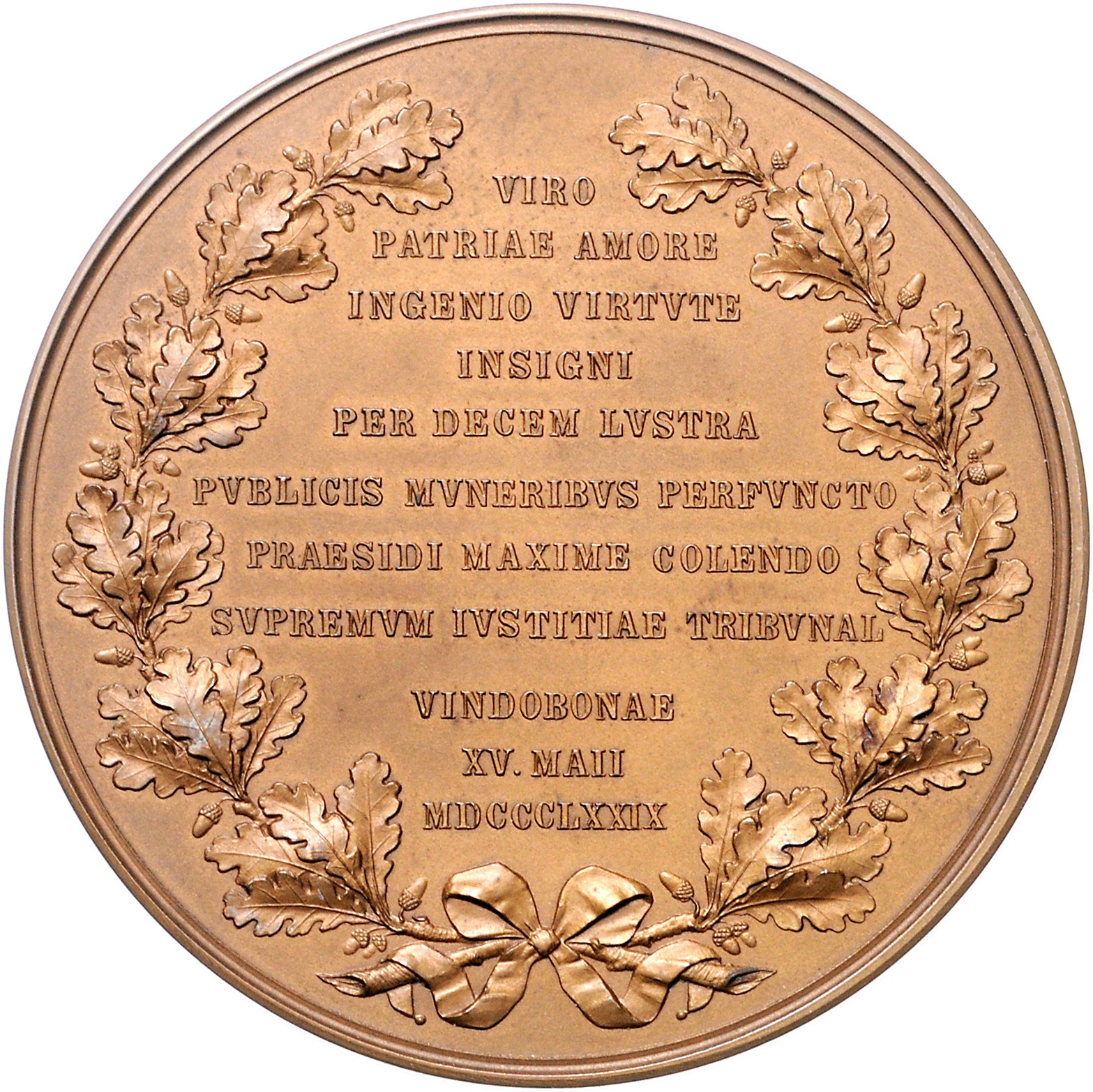 Bronzemedaille 1879 auf das 50-jährige Beamtenjubiläum von Dr. Anton von Schmerling, Präsident des Obersten Gerichtshofes in Wien. Hauser 7809, Loehr 43, Wurzbach 8253. mattiert 67,3 mm, 115,41 g. vz-st