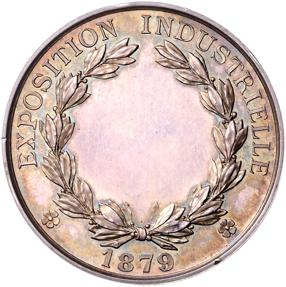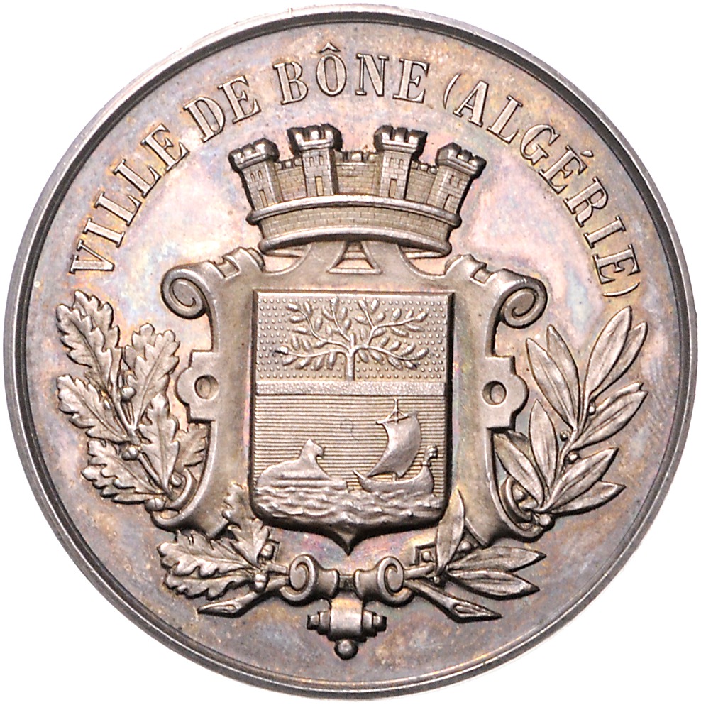 Französische Besatzung 1830-1962. Silbermedaille 1879 auf die Industrieausstellung in Bône (heute Annaba), i.Rd: Punze ARGENT. 42,5 mm, 40,04 g. vz-st