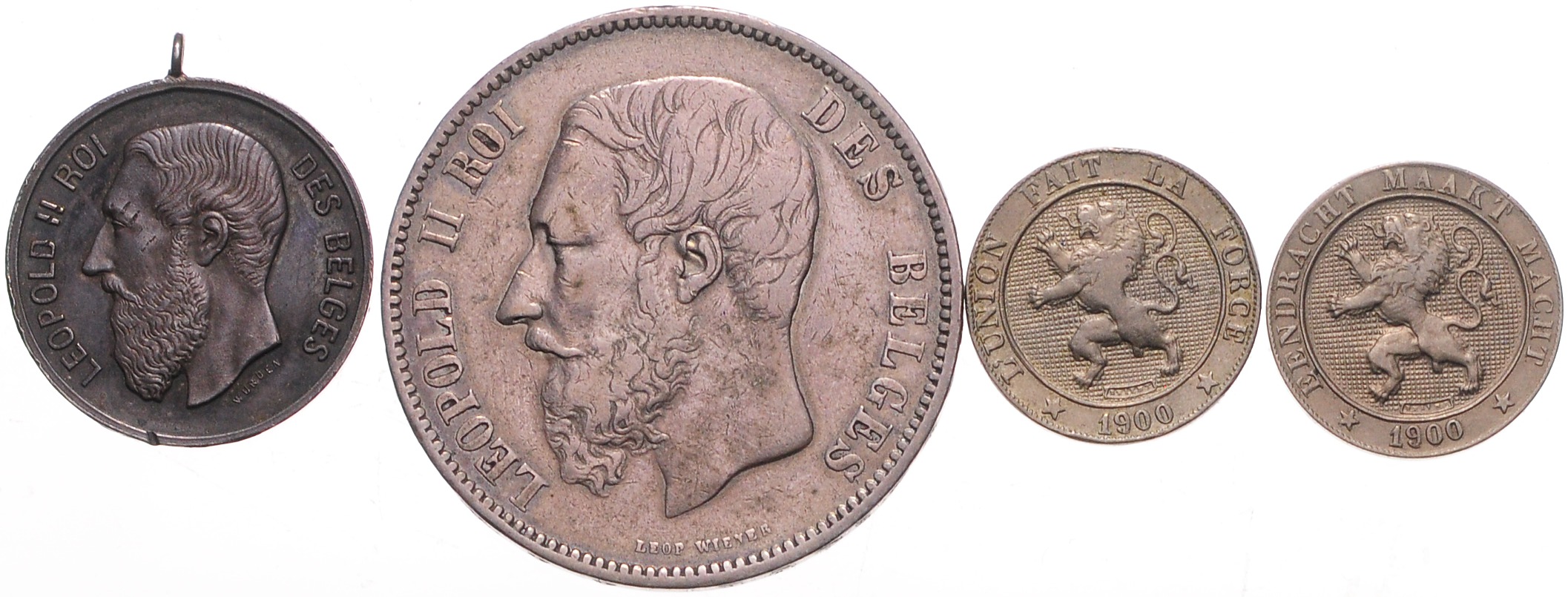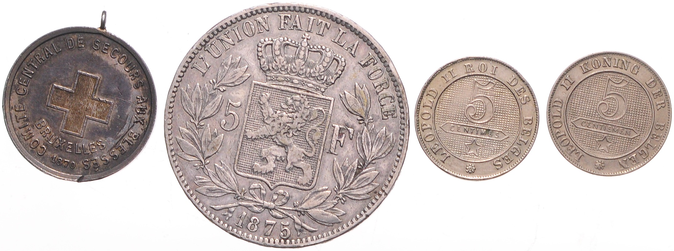 Leopold II. 1865-1909. Lot von 4 Stücken: 5 Francs 1875, je 1x 5 Centimes 1900 mit französischer und niederländischer Umschrift und Silbermedaille 1870 (v. Würden) auf die Verwundetenhilfe des Roten Kreuzes Brüssel (mit Öse 23,6mm 4,28g). K.M. 24, 40.1, 41. ss und vz