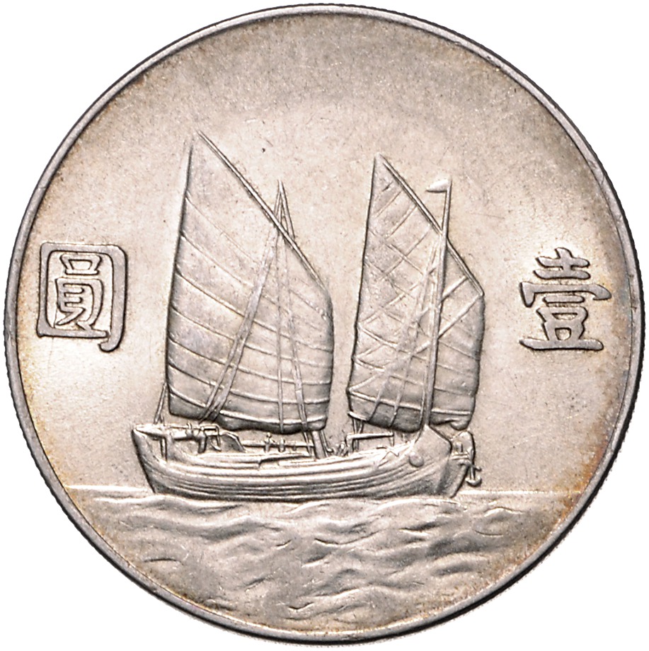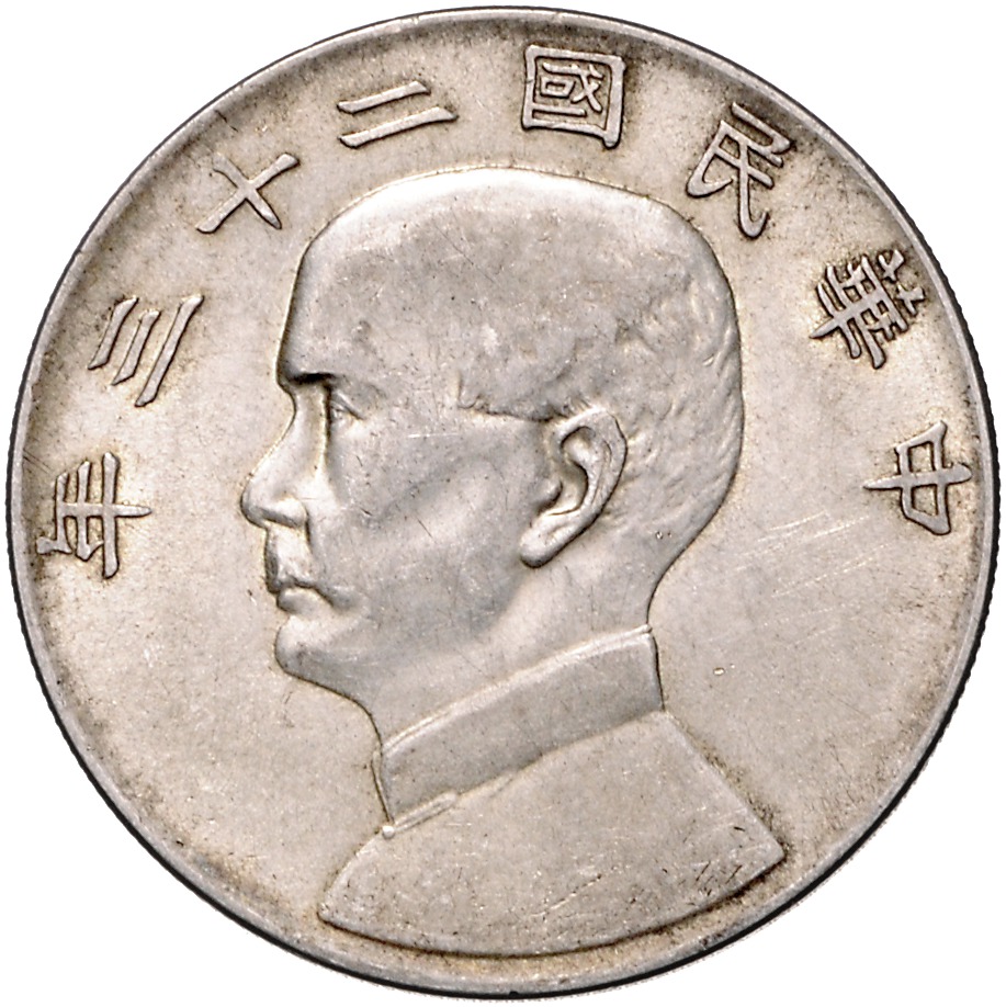 Republik 1912-1949. Dollar (Yuan) 1934 Year 23 Sun Yat-sen / Schiff. K.M. Y#345, LuM 110, Davenport 223. vz