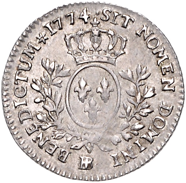 Ludwig XV. 1715-1774. 1/5 Ecu 1774 BB-Strasbourg á la vielle tête. Gadoury 300, Duplessy 1687. min. Prägeschwäche. vz