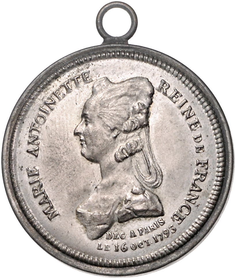 Ludwig XVI. 1774-1793. Einseitige Weißmetallmedaille 1793 (unsign.) auf die Hinrichtung von Marie Antoinette am 16. Oktober 1793. Exemplar SBV 2/97 Z=875 DM). hohlgefertigt, mit Öse 35,2 mm, 27,20 g. ss-vz