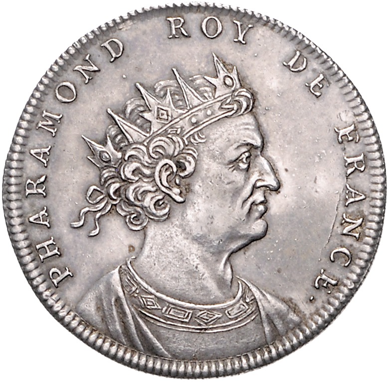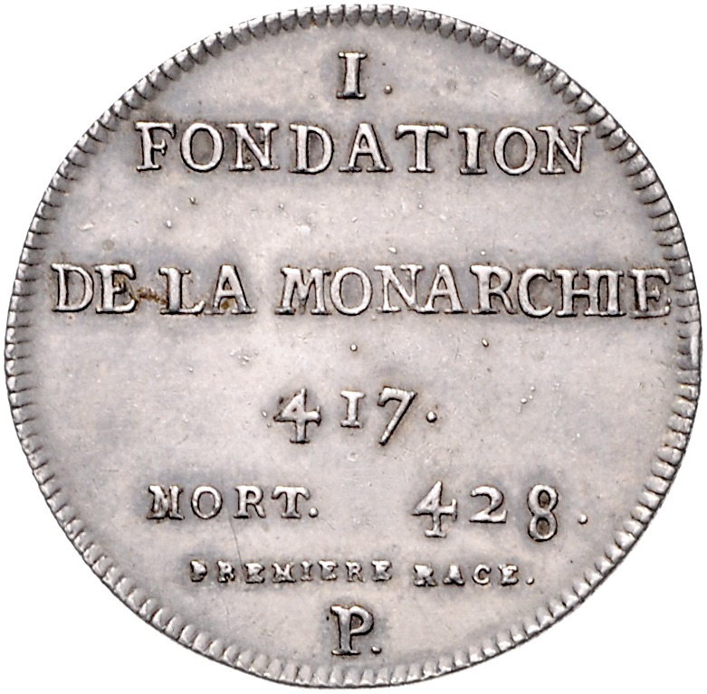 - Beschreibung: Ludwig XVIII. 1814, 1815-1824. Silbermedaille o.J. (v. Caque) auf Pharamond, 1. König der Merovinger bzw. Franken. Erste Medaille aus der Serie `Galerie der Könige Frankreichs` (74 Medaillen). Die Rückseiten der Medaillen der Serie sind wie folgt zu entschlüsseln: Geburtsdaten (sofern bekannt), die Thronfolge und das Todesdatum. Der Buchstabe unten gibt die Verwandtschaftsbeziehung zum jeweiligen Vorgänger an: P. steht für pere (Vater) , F. für frere (Bruder), N. für neveu (Neffe) und C. für Cousin. Der Buchstabe M in Mort (Tod) in Druckbuchstaben bedeutet, dass der Monarch eines natürlichen Todes starb. Der Buchstabe in Schreibschrift bedeutet einen gewaltsamen Tod. Ein Sternchen auf der Rückseite einer Medaille bedeutet, dass die Information nicht sicher ist. 33,5 mm, 11,50 g. vz