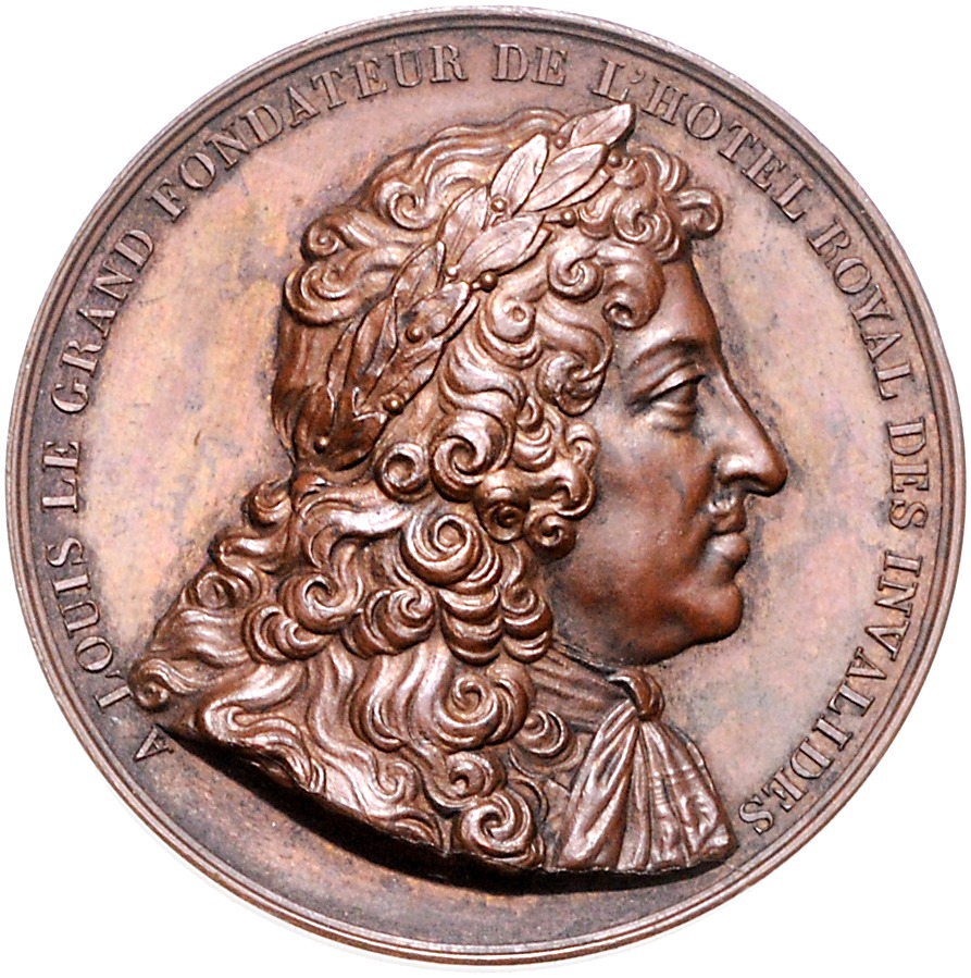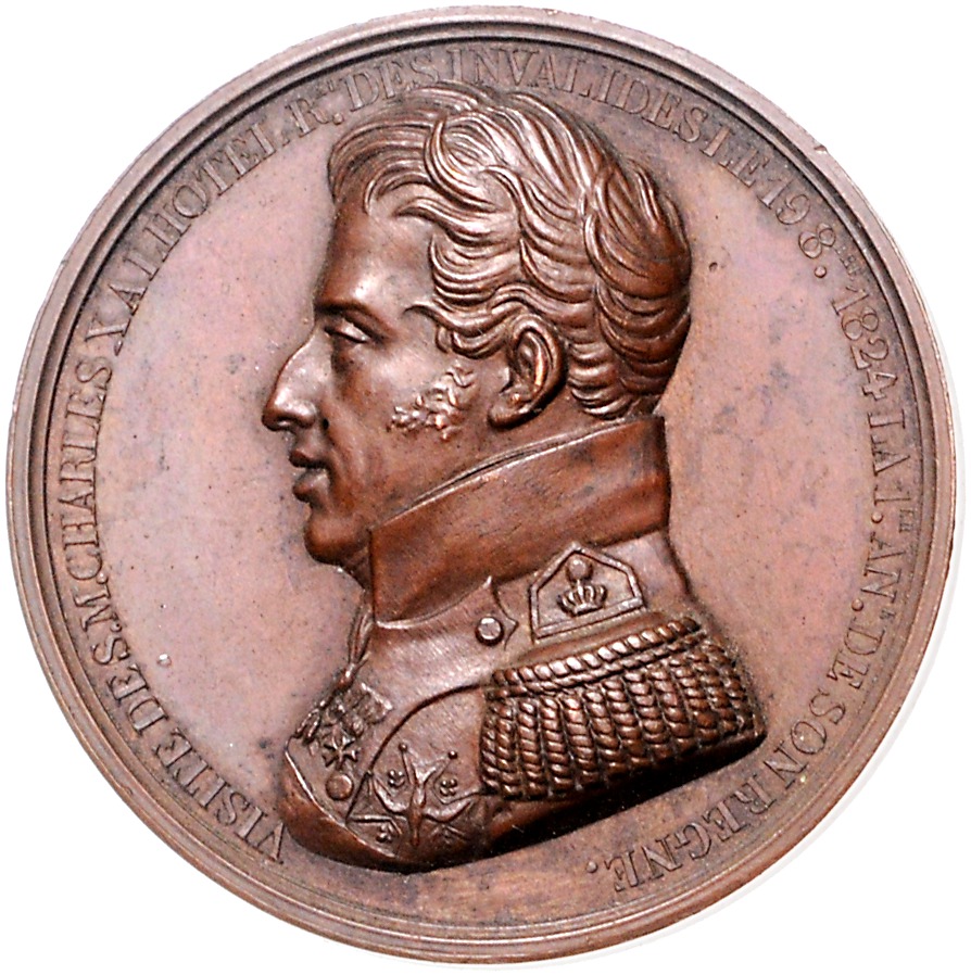 Charles X. 1824-1830. Bronzemedaille 1824 (unsign.) auf seinen Besuch des Hôtel des Invalides. Uniformiertes Brustbild l. / Brustbild von Louis XIV. 38,0 mm, 28,95 g. vz