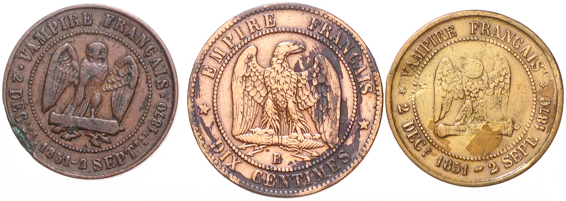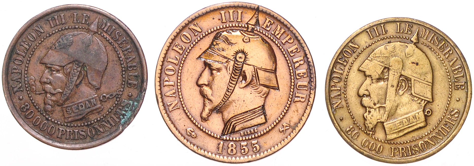 Napoleon III. 1852-1870. Lot von 3 verschiedenen Spottmedaillen, mit Pickelhaube. Korrosionsspuren. ss