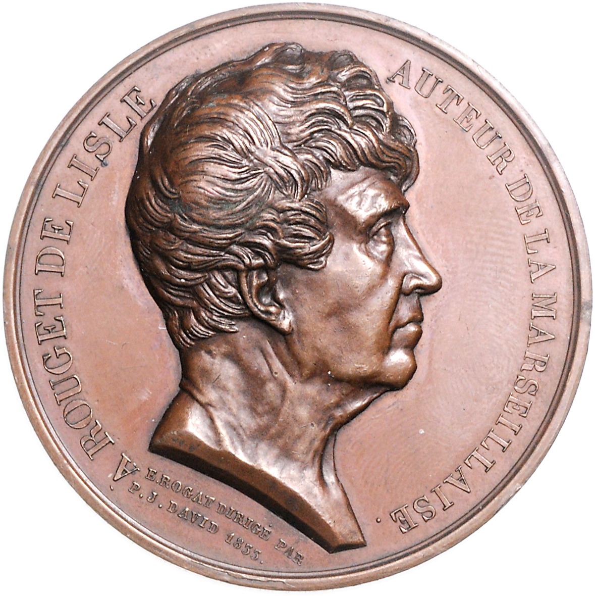 - Beschreibung: Lots. Lot von 3 Stücken: Bronzemedaille 1842 (v. Rogat) auf Louis Marie de Cormenin 1788-1868, frz. Publizist und Mitglied der Nationalversammlung, i.Rd: Schiffsbug CUIVRE (50,6mm 73,12g) | Bronzemedaille 1834 (v. Rogat) auf Eusebius Salverte 1771-1839, Politiker und Schriftsteller (50,4mm 78,66g) | Bronzemedaille 1833 (v. Rogat) auf Rouget de Lisle 1760-1836, Komponist und Schöpfer der `Marseillaise` (51,0mm 62,75g). Niggl 1727. vz