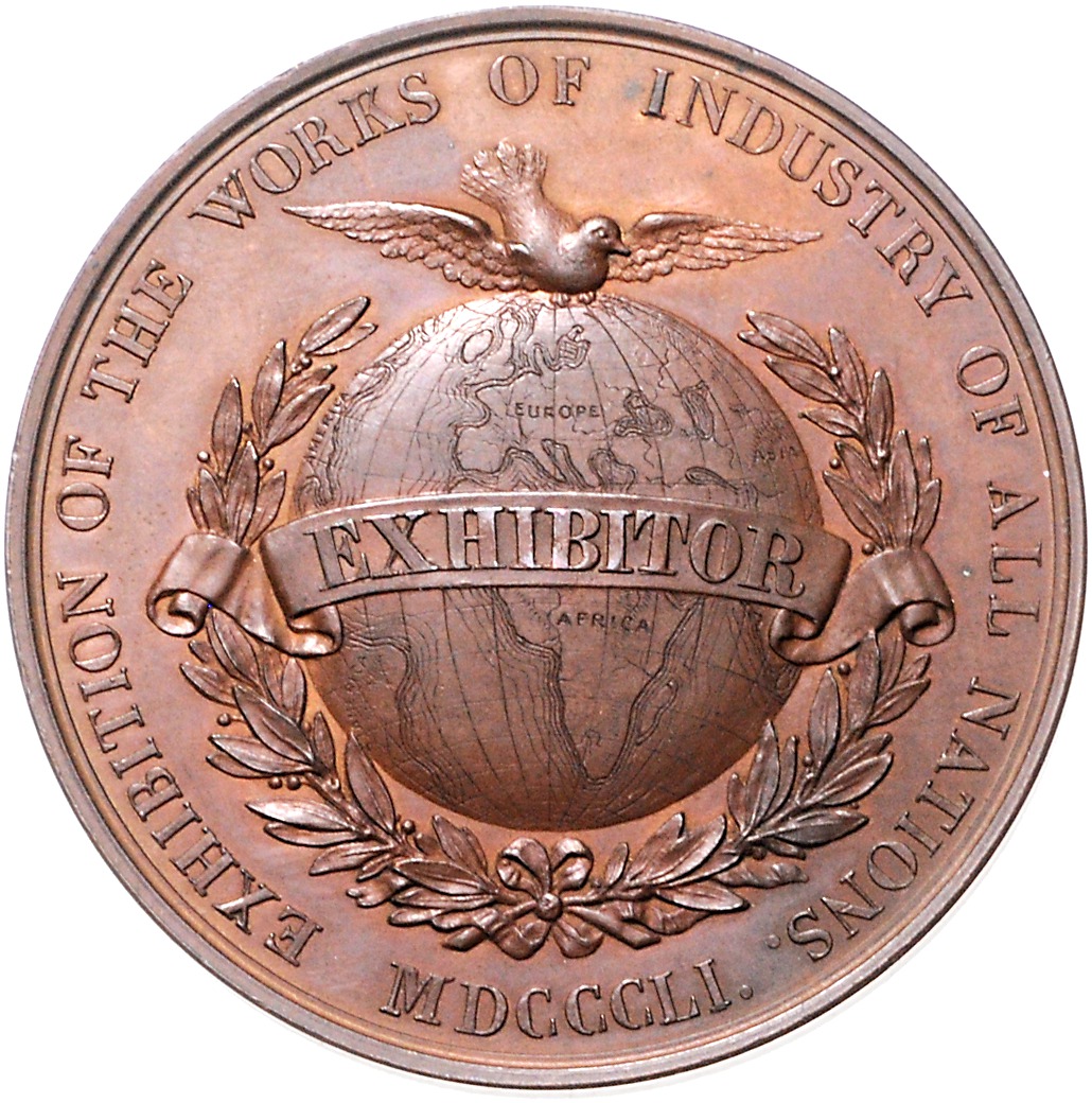 Victoria 1837-1901. Bronzemedaille 1851 (v. Wyon) Exhibitor's-Medal der Weltausstellung in London, i.Rd: FRANCE. No 1220. Eimer 1462. 44,3 mm, 62,76 g. vz-st