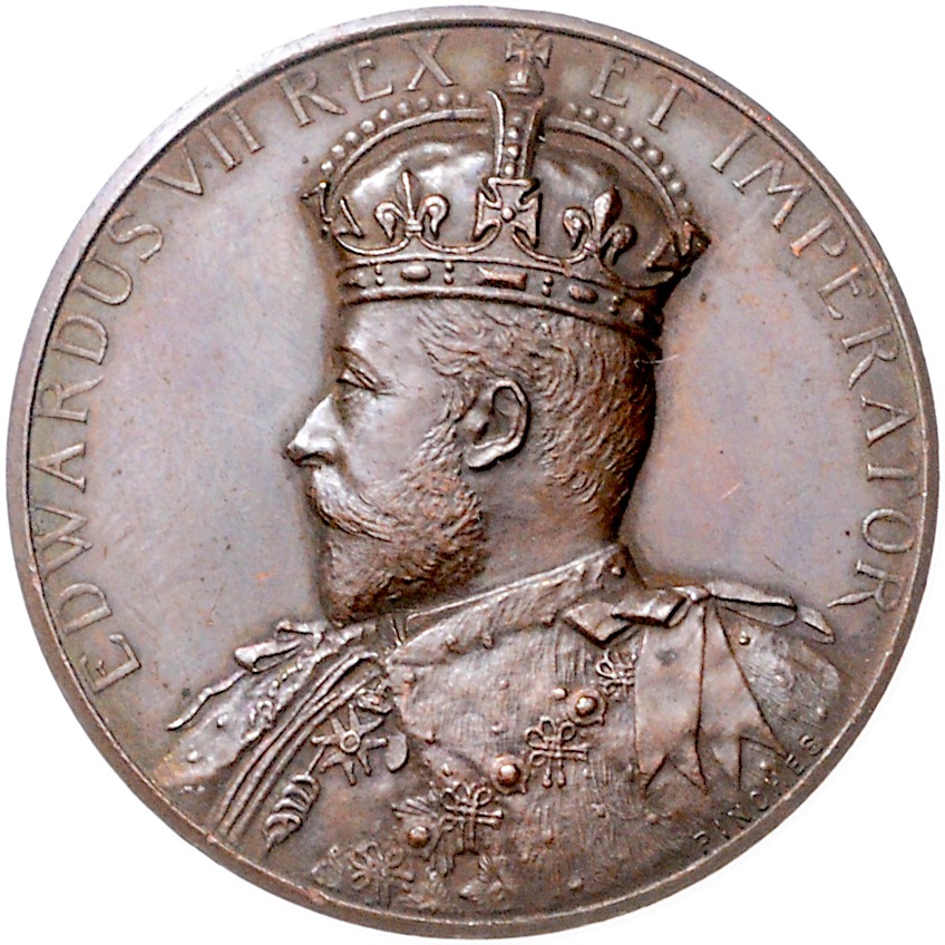 - description: Lots. Lot von 3 Stücken: Bronzemedaille o.J. (v. F. Bowcher für Spink & Son) auf das Diamantene Thronjubiläum von Königin Victoria. Eimer 1820i. 38,2mm 19,88g | Bronzemedaille o.J. (1902, v. Pinches) auf die Krönung von Edward VII. BHM 3799. 36,4mm 25,69g | Bronzemedaille o.J. (1937, v. Pinches) auf den Regierungsantritt von George VI. und Queen Elizabeth. BHM 4331. 35,1mm 18,64g. meist vz