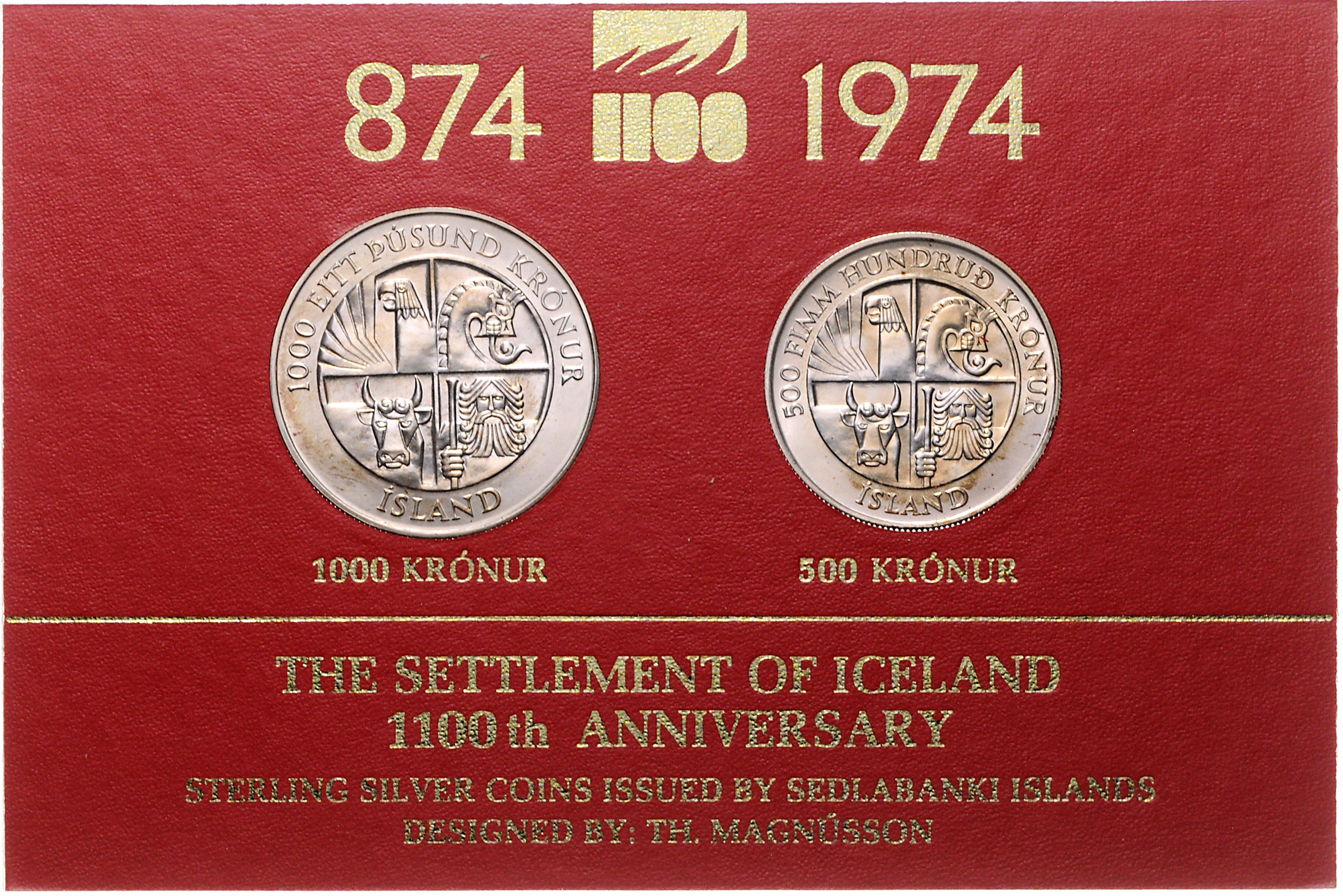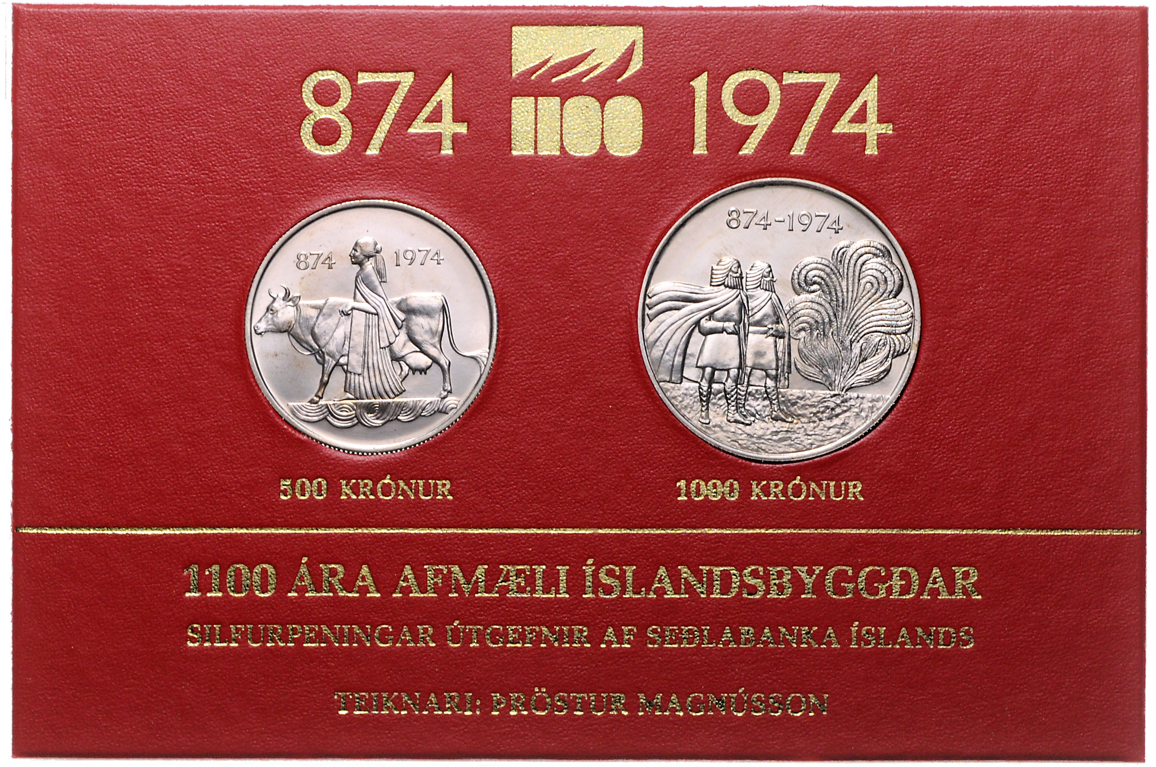 Münzsatz 1974 bestehend aus 500 und 1000 Kronur auf den 1100. Jahrestag der ersten Besiedelung. K.M. MS6 (20,21). in Originalverpackung. st